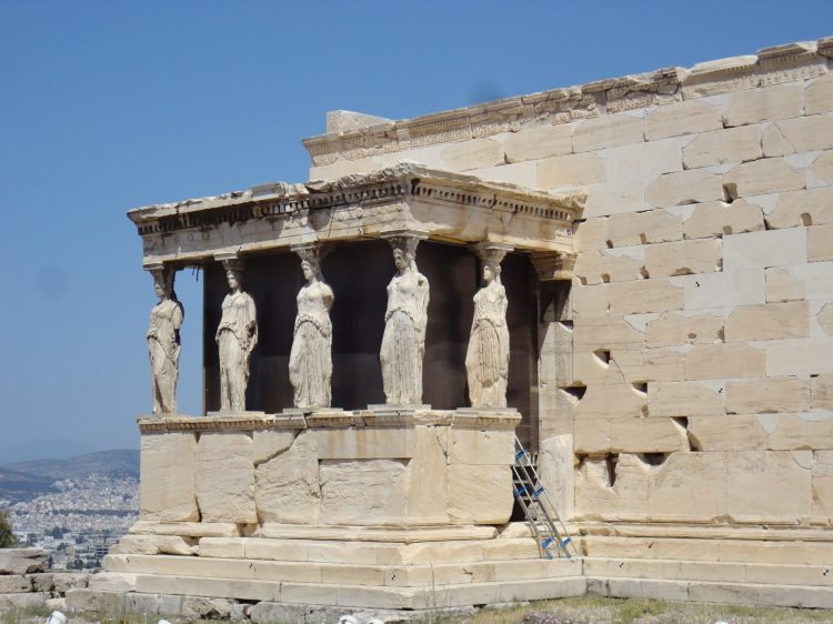 O Erectheion é um templo jônico construído entre os anos 420 e 406 a.C no lugar mais sagrado da Acrópole e o mais impressionante nele é a cobertura, que é sustentada pelas famosas Cariátides, 6 colunas gigantes esculpidas como estátuas femininas. As que estão lá hoje são cópias das originais, que foram removidas para o Museu da Acrópole. São lindíssimas!