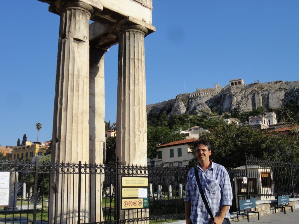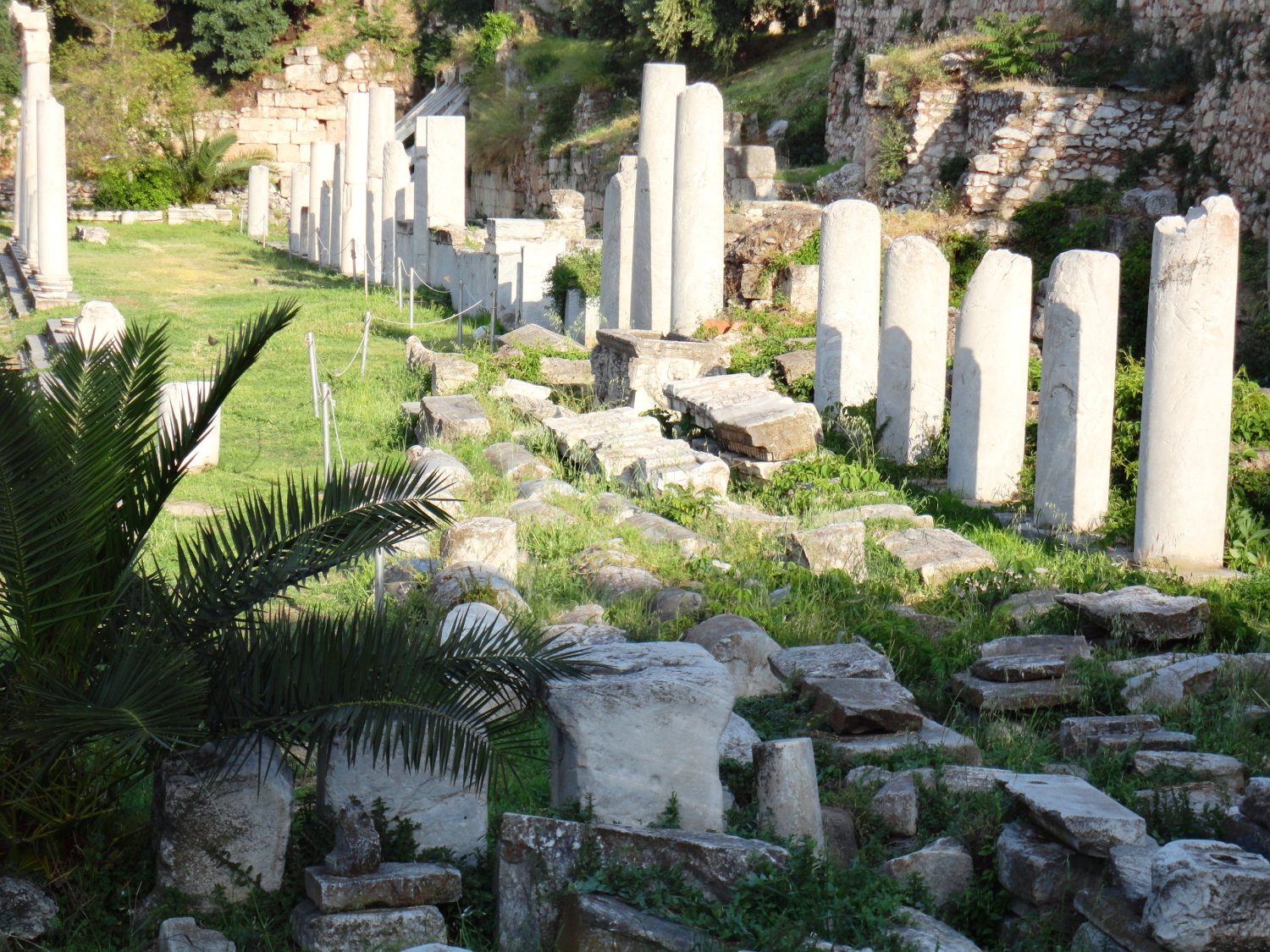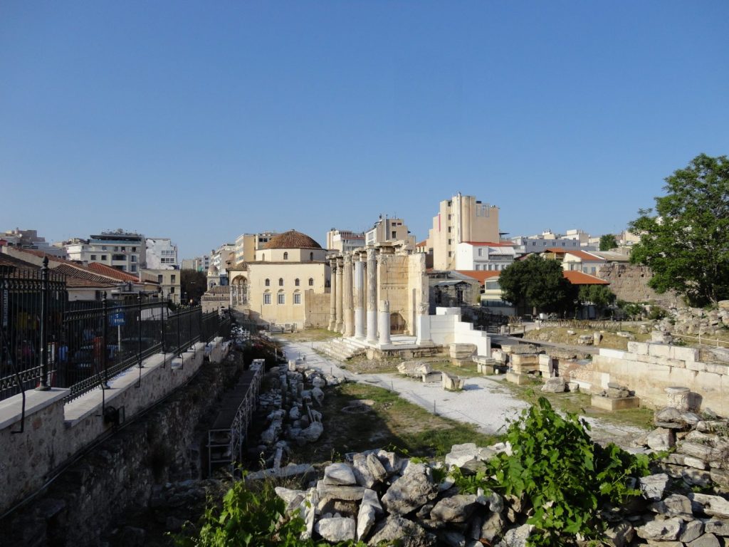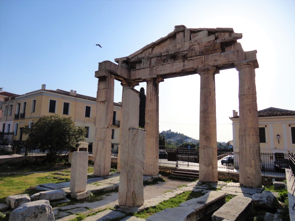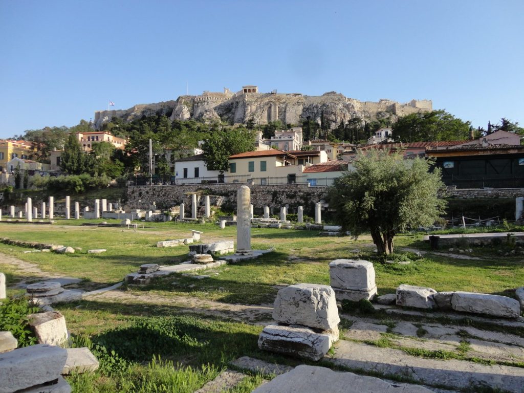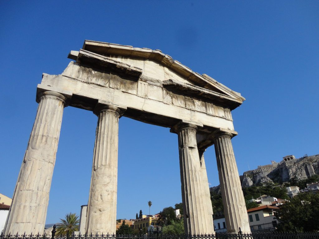 A porta de entrada, a Porta de Atena Arquegetis, com suas quatro colunas dóricas em mármore branco, permaneceu em pé e as ruínas dão uma boa ideia da grandiosidade da Ágora. Ela foi construída no ano 11 antes de Cristo com doações dos imperadores Júlio Cesar e Augusto. A partir dali tem-se uma vista muito bonita da Acrópole lá em cima.