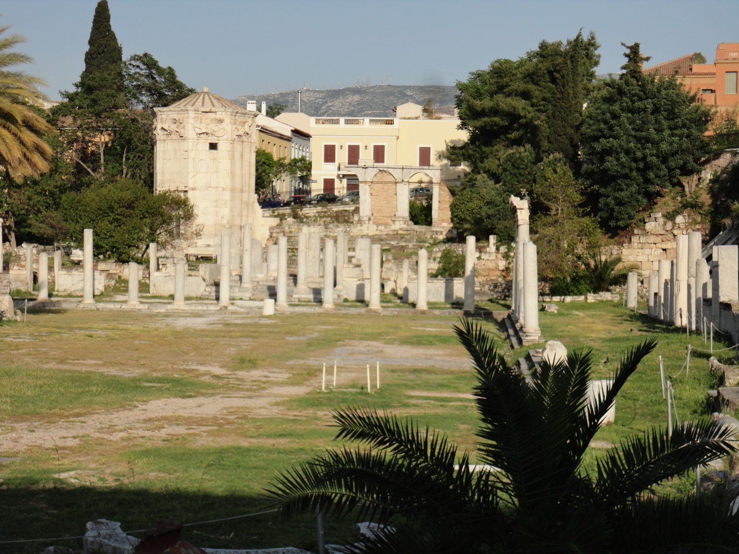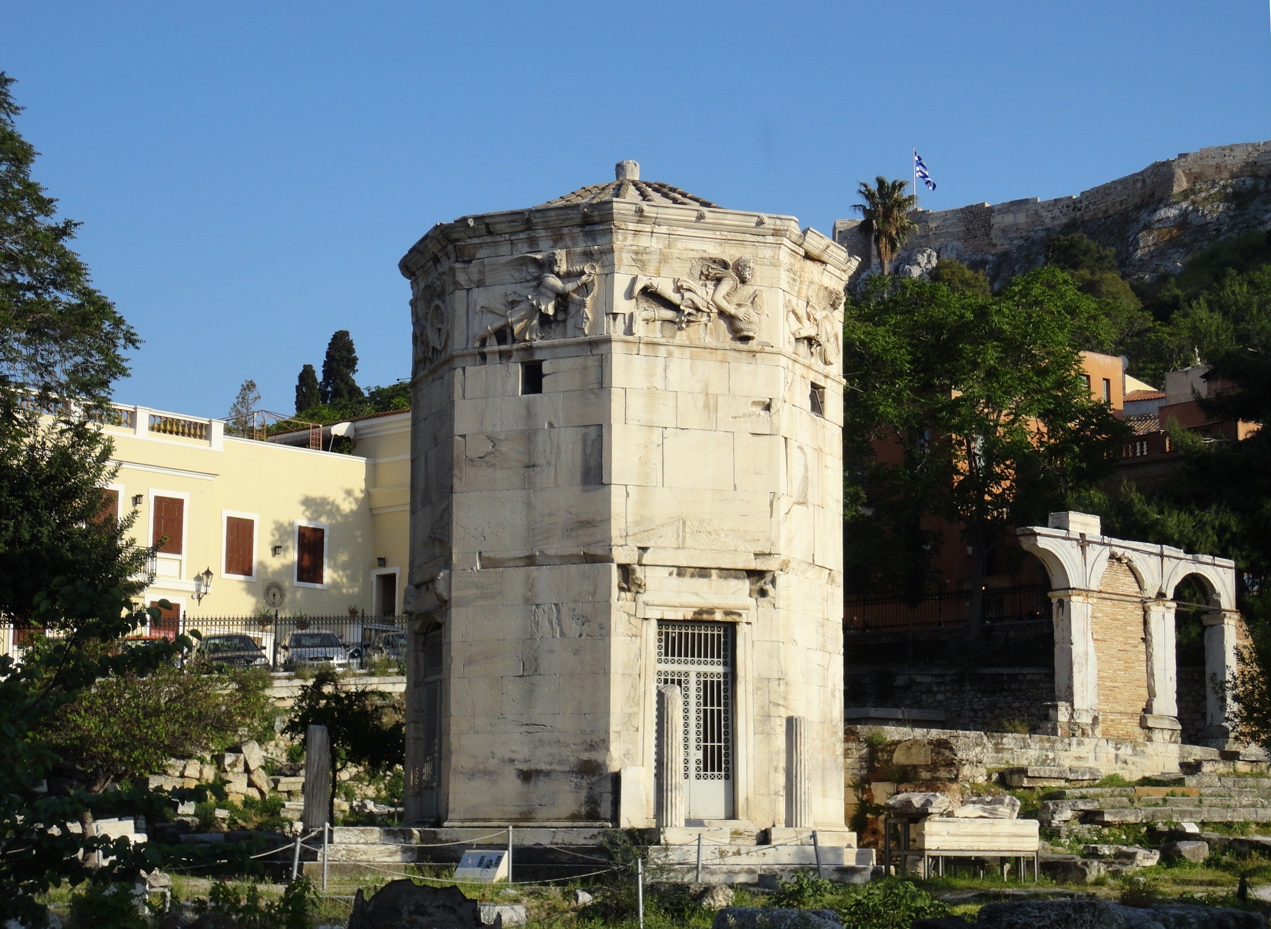 Ainda na Ágora Romana está um edifício octogonal em mármore, construído no século I a.C. pelo astrônomo Andrônico de Cirro – a Torre dos Ventos. Com 12m de altura por 8m de diâmetro, antigamente tinha no topo um cata-vento com o desenho de um Tritão, que indicava a direção do vento. Ela foi a 1º torre de relógio e estação meteorológica que se tem notícia. No friso há relevos que representam as oito divindades gregas para o vento. No interior havia um relógio d´água (clepsidra), movido pela água que vinha da Acrópole.