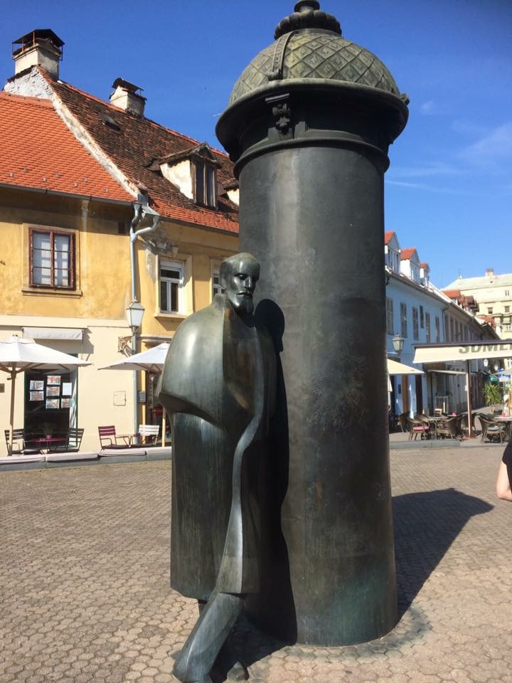 August Šenoa foi um romancista e jornalista do século XIX, autor do primeiro romance histórico croata. A estátua de bronze que o homenageia o mostra encostado a um pilar, onde está gravado um poema dele dedicado à Zagreb, sua cidade natal. Ela fica na Vlaska, rua que mantém seus rés-do-chão e sua arquitetura tradicional e se estende por trás dos muros que rodeiam a Catedral. Foi nessa rua que Šenoa nasceu e por ela passávamos todos os dias saindo do Hotel Jadran em direção à Praça Jelačić. Šenoa morreu em Zagreb, aos 43 anos, de uma doença que contraiu após o terremoto de 1880 que destruiu grande parte da cidade.