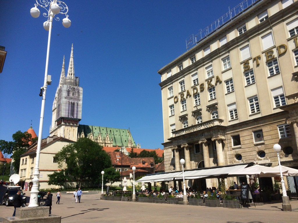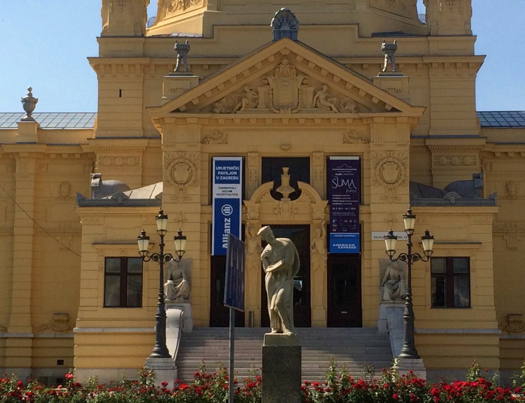 Passando pelo Parque Zrinjevac e caminhando no sentido da estação de trem (a Glavni Kolodvor), chegamos à Praça Kralja Tomislava, uma bonita área verde. No centro do gramado fica o lindo edifício neoclássico do Pavilhão das Artes, de 1896. Uma curiosidade é que o Pavilhão foi construído para a Exposição do Milênio em Budapest (celebração nacional promovida pelo Império austro-húngaro) e só depois foi trasladado, de trem, para o local atual. O entorno da praça é bem movimentado, tanto com locais como turistas, especialmente num dia de sol como o que pegamos.