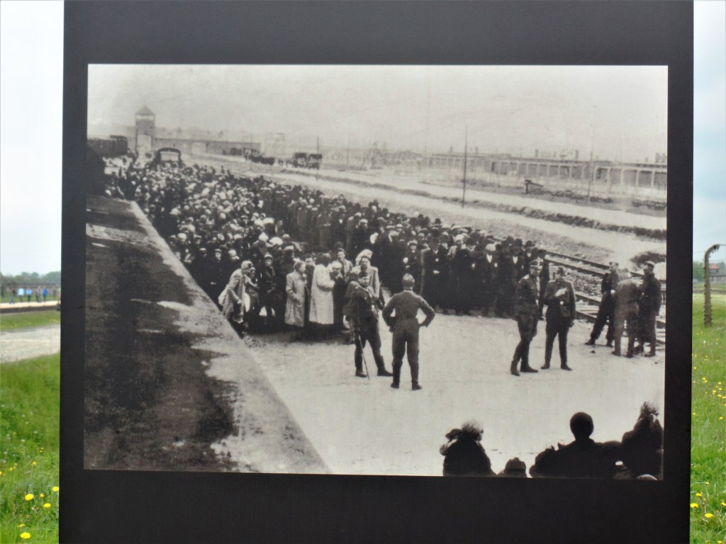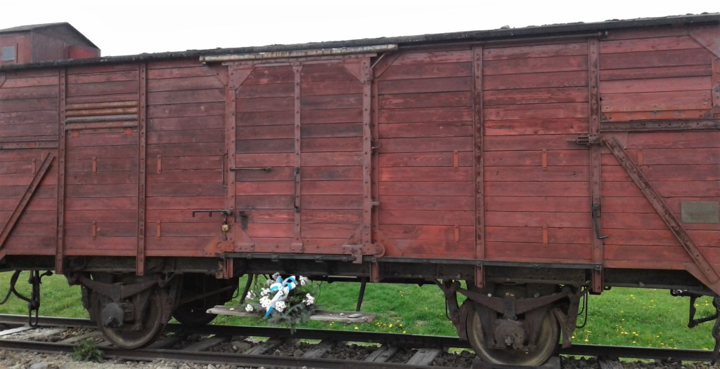 Um dos vagões dos trens que transportavam os prisioneiros também foi mantido ali, ao lado da estrada de ferro e um painel mostra uma foto do desembarque em Birkenau.