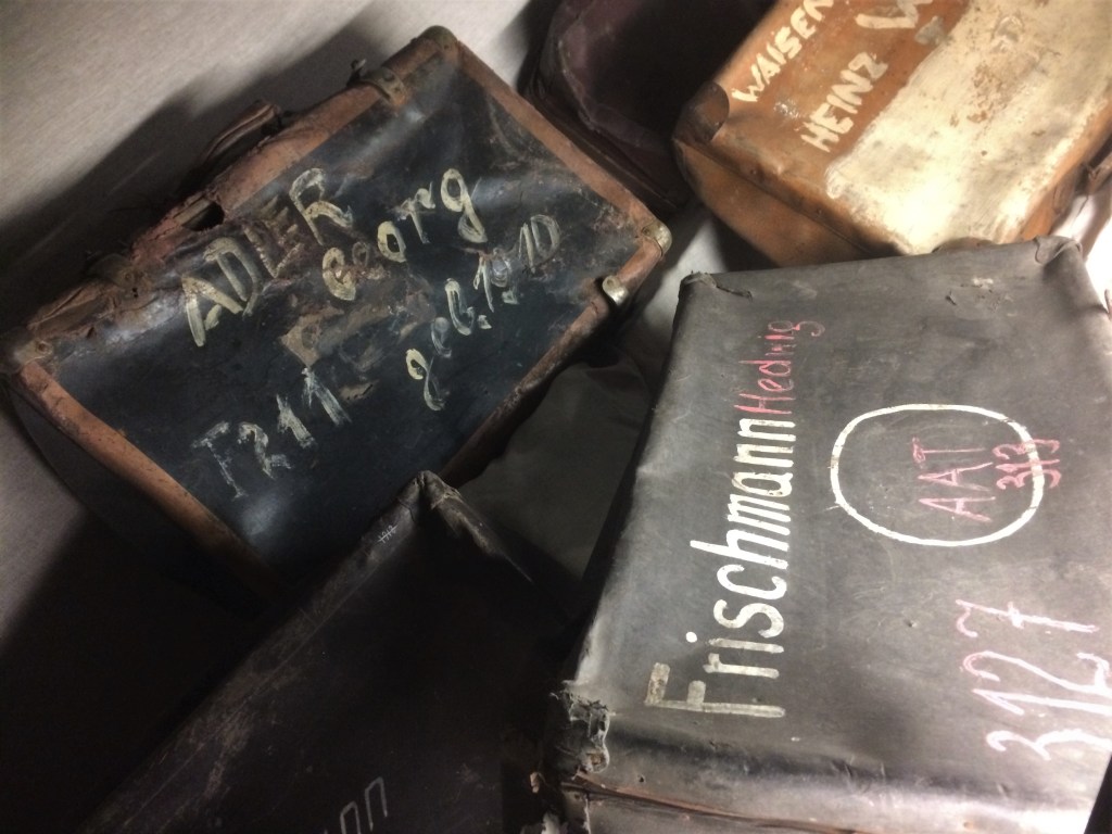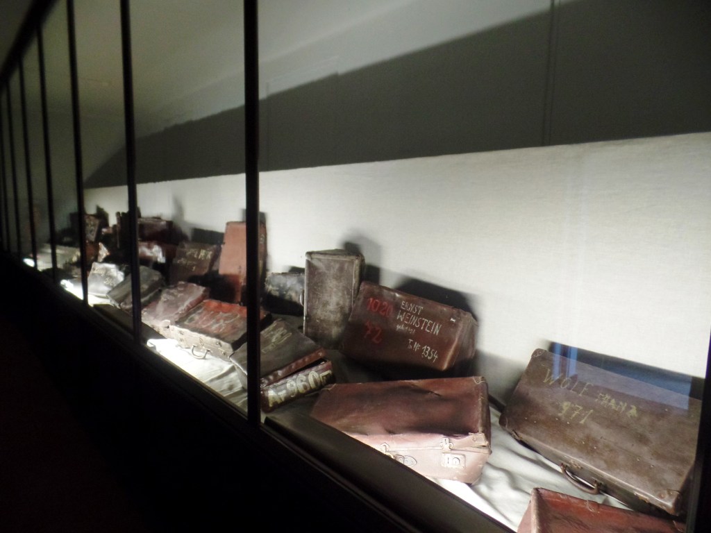 Quando eram deportadas, como vimos na evacuação do Gueto de Pódgorze, as pessoas carregavam malas com seus pertences (os oficiais da SS lhes diziam que podiam levar apenas 15 quilos). Assim, logo que chegavam em Auschwitz mandavam que escrevessem seus nomes nas malas, o que elas faziam – achando que depois recuperariam suas coisas. Logo no início do tour vemos várias fotos do desembarque e também várias dessas malas. Mais tarde, em Birkenau, é possível ver também um dos vagões dos trens que transportavam os prisioneiros.