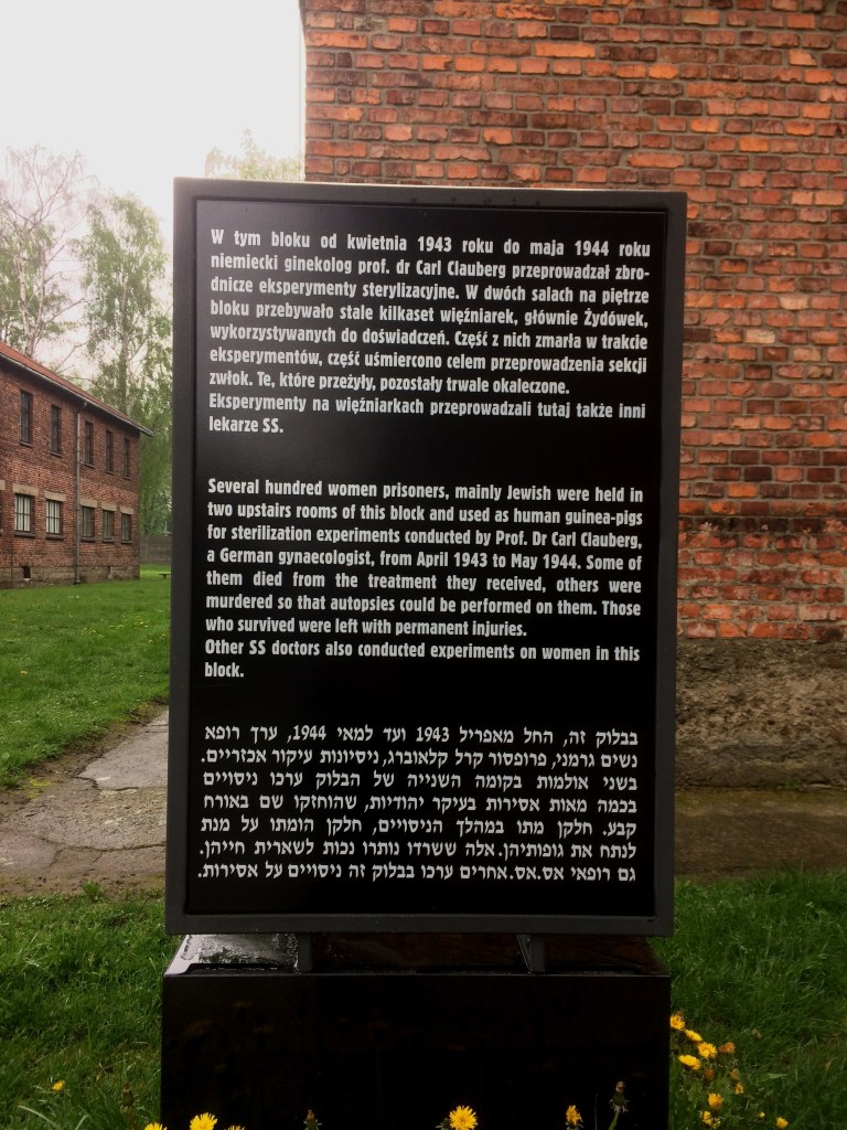 Depois de visitar o interior do prédio principal, visita-se outros alojamentos e inclusive o prédio onde o médico nazista Joseph Mengele, conhecido como o “monstro de Auschwitz” fazia suas experiências de esterilização em mulheres e de transplantes de órgãos com os prisioneiros. Ele era um dos médicos responsáveis pela seleção dos que seriam mandados para a câmara de gás. Uma de suas pesquisas consistia em obrigar as mulheres com bebês pequenos a atarem os seios com faixas para “estudar” quanto tempo levaria para que os bebês morressem de fome. Ele também tinha fixação por gêmeos e os mantinha vivos para conduzir experiências monstruosas. Seu objetivo com esses “estudos” era provar a supremacia ariana.