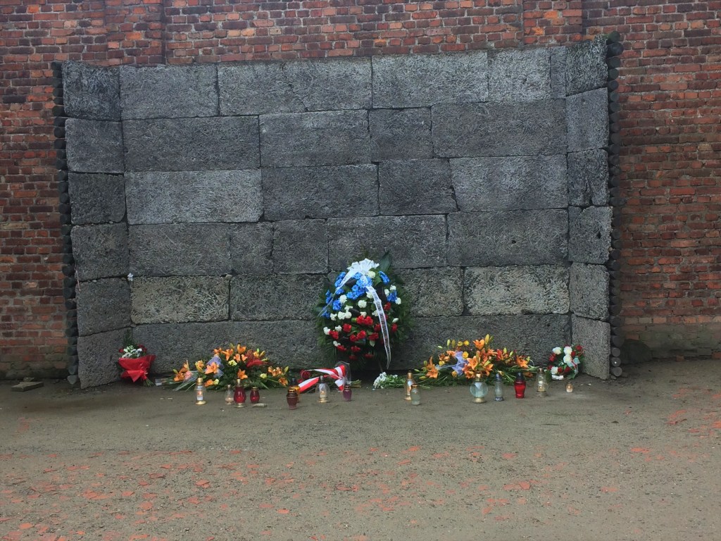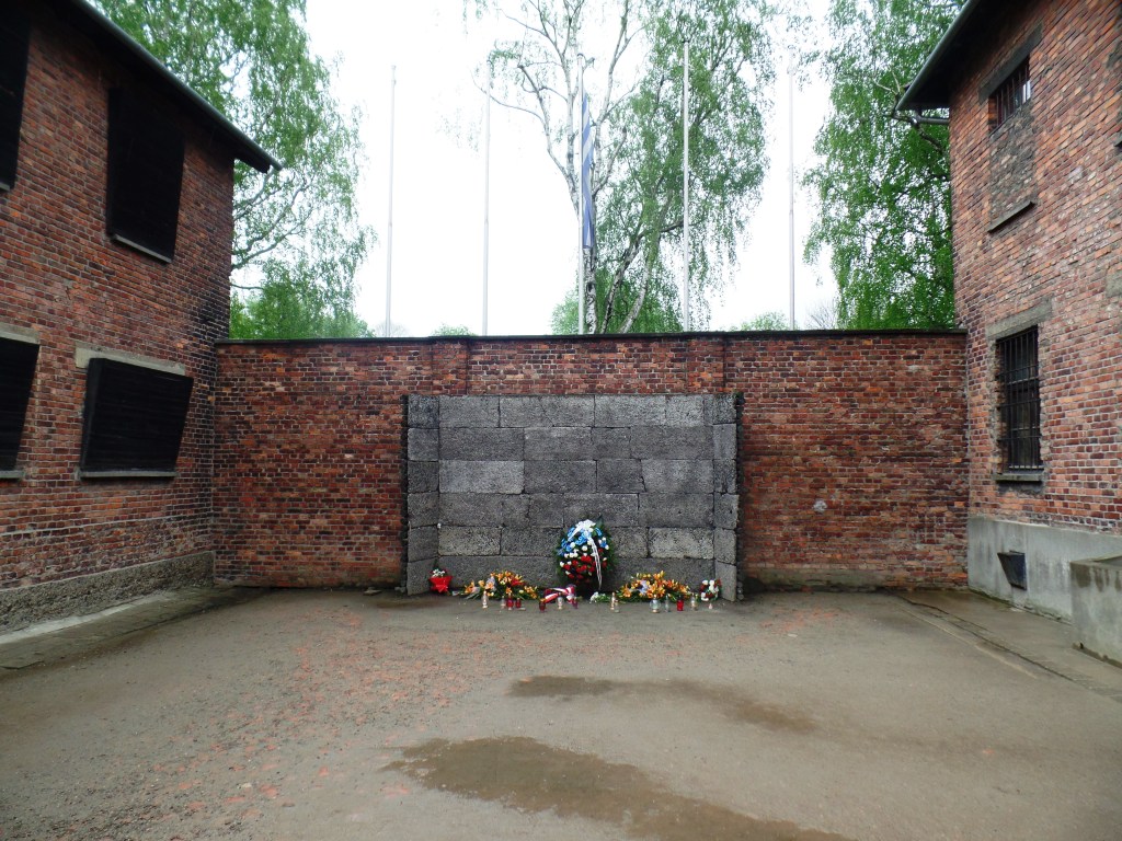 Outro ponto em que a guia faz uma parada para explicar é um muro que está sempre adornado com flores no chão – ali era o Paredão de Fuzilamento onde os prisioneiros não aptos para o trabalho eram imediatamente mortos e também onde os nazistas fuzilavam os desobedientes.
