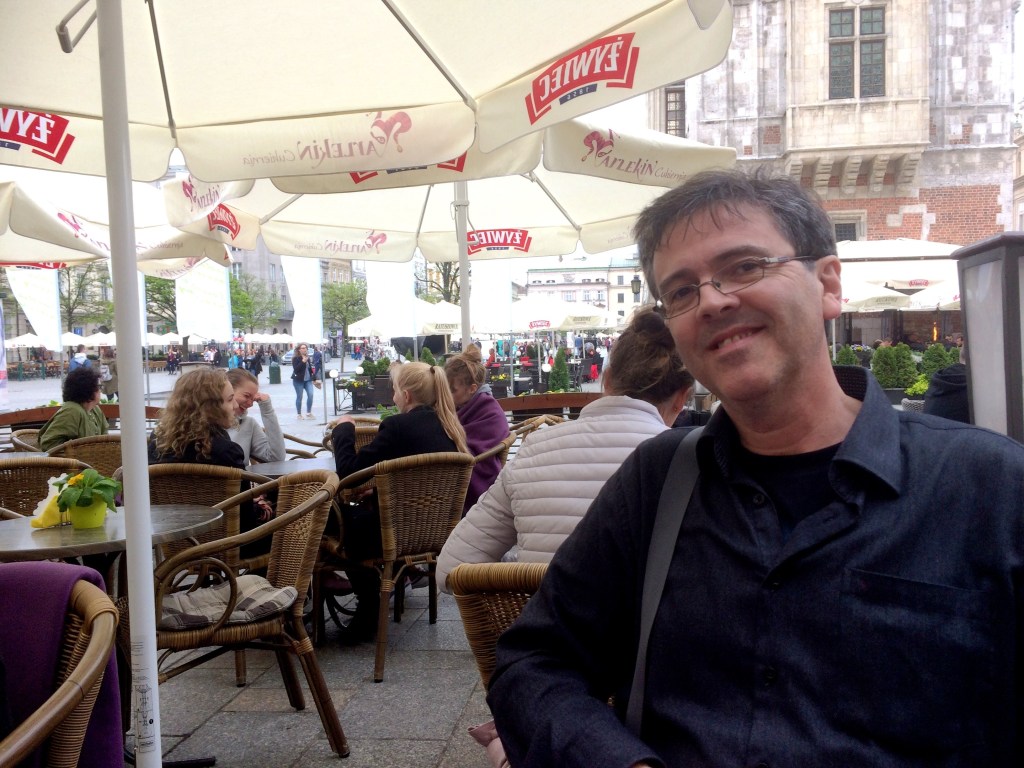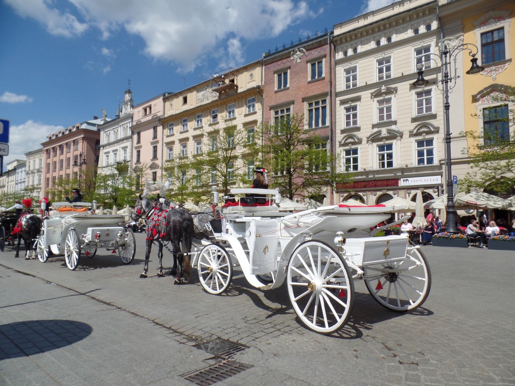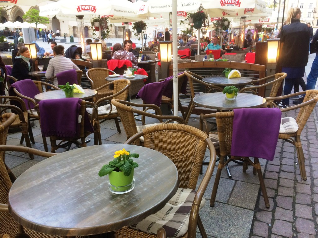 Paramos também no Sioux num fim de tarde para tomar um café e não resistimos às tortas do cardápio! O restaurante é bem em frente à Praça Rynek Glówny e tem mesas ao ar livre bem gostosas. De lá ficamos apreciando o movimento das carruagens levando os turistas e tirando fotos da medieval Torre da Prefeitura. Mesmo na primavera esfria um pouco à noite e achamos muito interessante cada cadeira ter uma manta para os clientes se cobrirem enquanto comem e bebem.