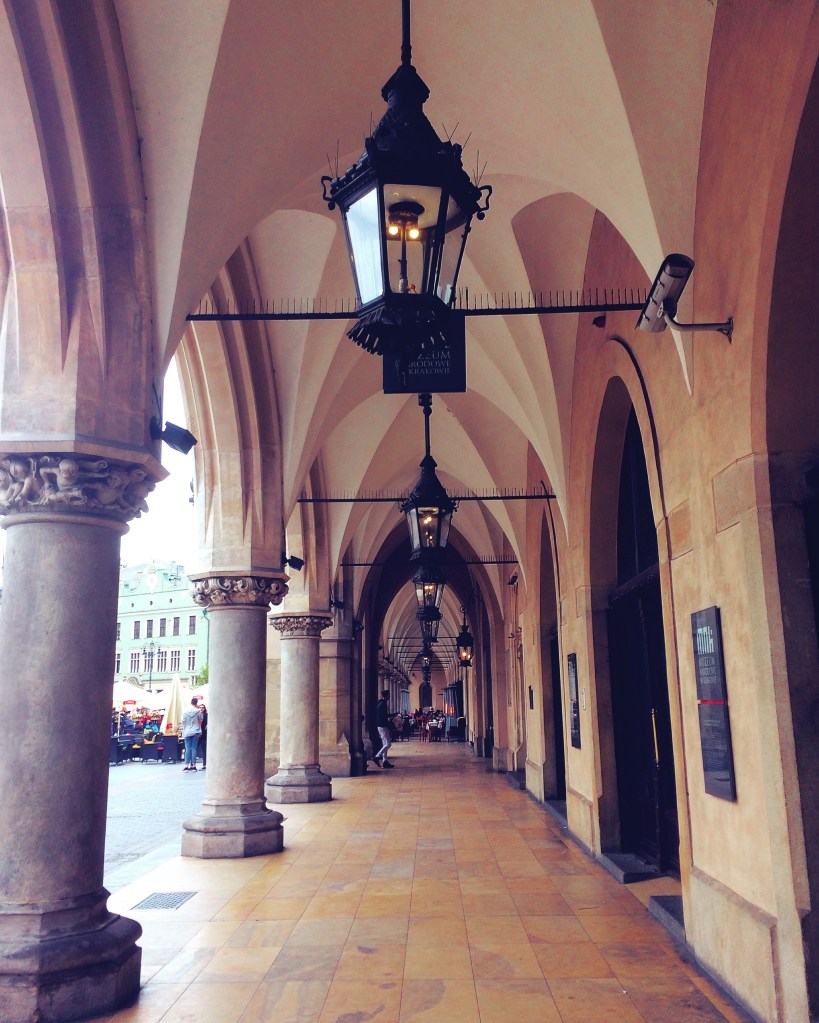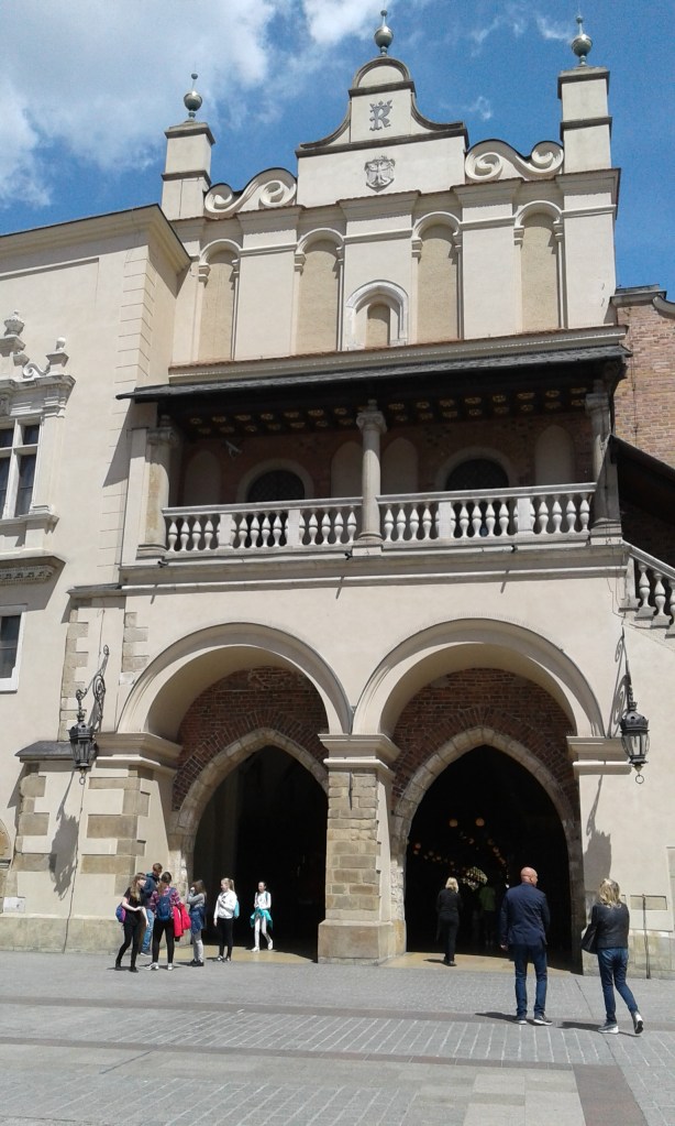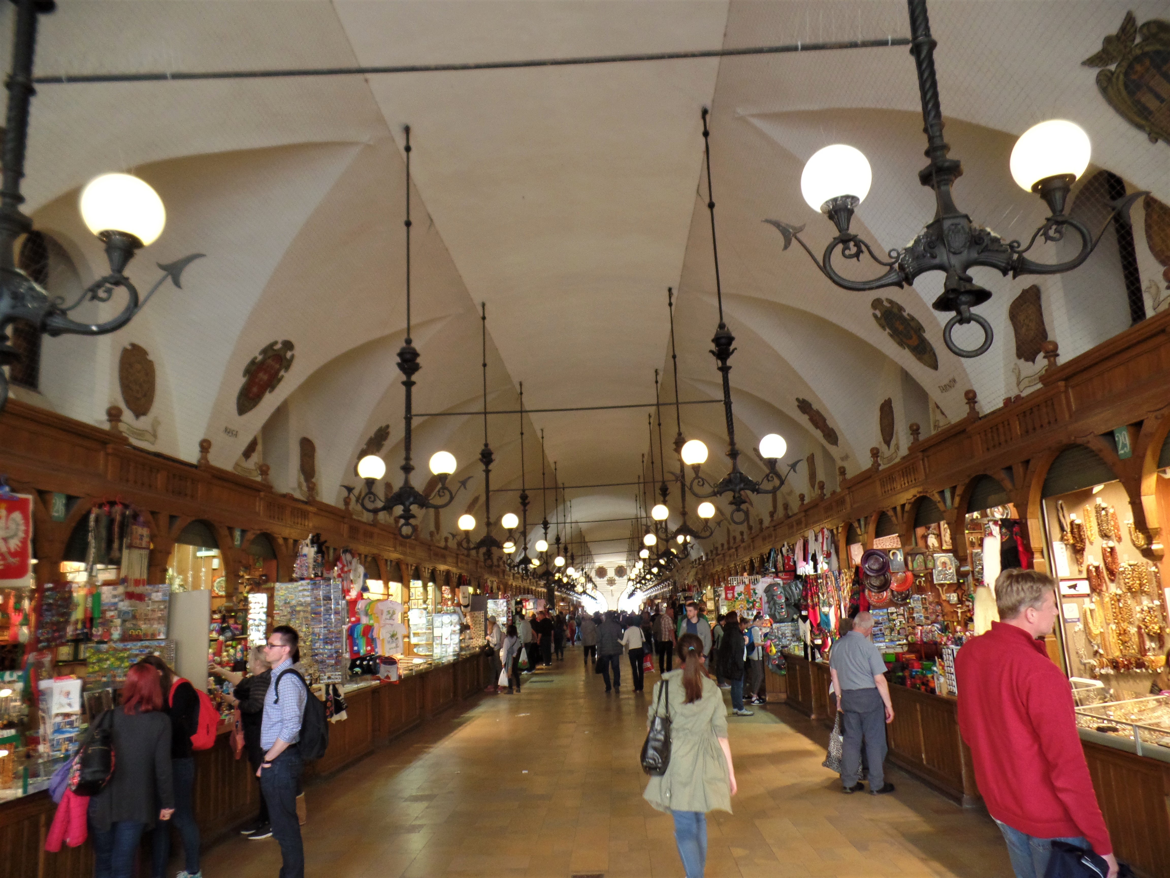 Também na Praça principal (Rynek Glówny) está o Sukiennice (Mercado). É realmente incrível saber que se está em um edifício construído no séc. XIV e que até hoje é utilizado para o mesmo propósito – ser um mercado. A beleza da construção atesta a prosperidade e importância que a cidade tinha na época. Chamado de “Mercado de Tecidos”, atualmente tem muitas barracas de souvenirs e artesanato local. Comprei babuskas lindas lá. Logo na entrada há um facão pendurado sobre a porta principal, para lembrar o que acontecia com quem resolvesse roubar. Atenção para o piso! Sendo uma “loja”, há um grande e lindo mosaico da maçonaria no meio da construção.