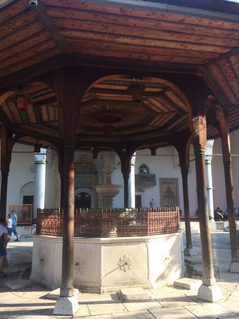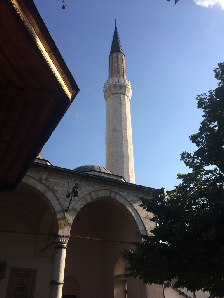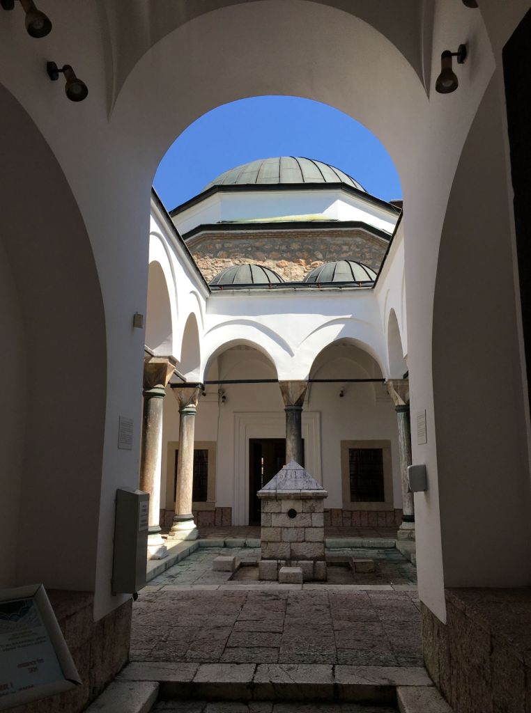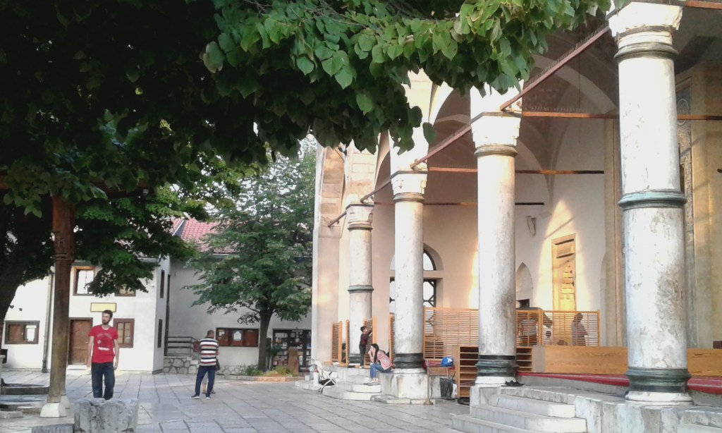 A Mesquita de Gazi Husrev-Beg é a mais importante da cidade pois foi mandada construir por ele e lá estão seus restos mortais. Pode-se visitar o pátio interno, e, fora do horário das orações, a parte interna. Há também uma grande fonte na entrada, além de uma bica de água fresca no muro do lado de fora (onde parávamos sempre para encher nossas garrafinhas e aplacar o calor).