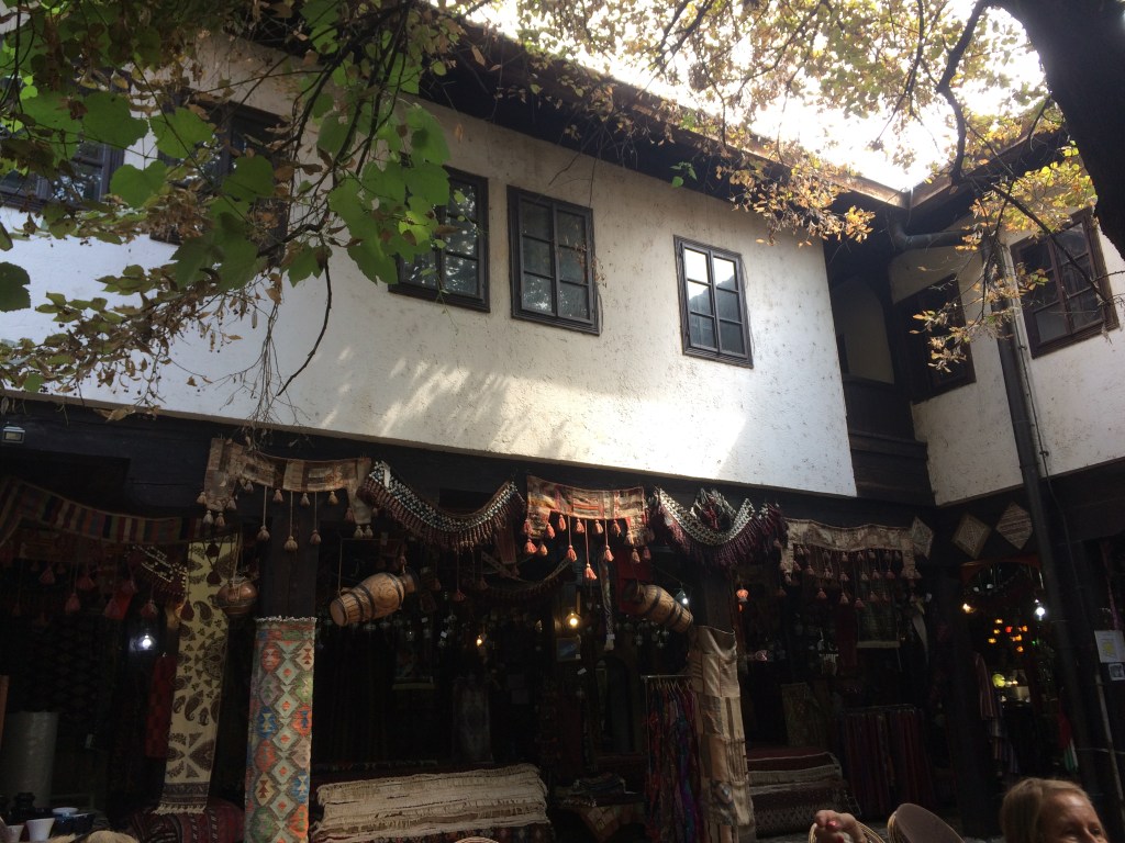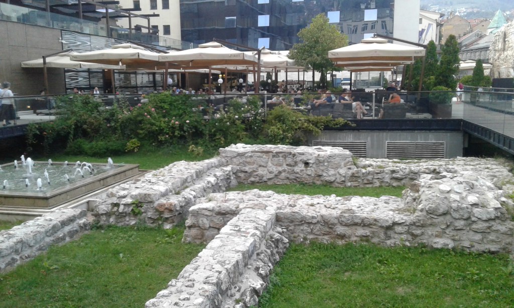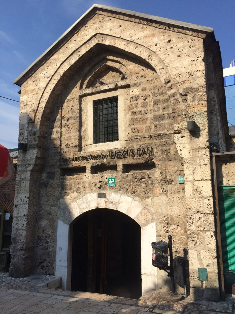 E por falar em negociar… logo depois de construir o TališHan, Gazi Husrev-beg mandou erguer ao seu lado o primeiro “shopping” de Sarajevo – o Bezistan (mercado coberto). Ele fica na esquina da rua Ferhadija com a Gazi Husrev-Begova, ainda está inteiro e é usado até hoje! É bem interessante o fato de ele ficar abaixo do nível da rua (pois antigamente o pavimento era naquela altura). Tem muitas lojas, mas as mercadorias não são muito diferentes do que se vê no comércio de rua. São lembrancinhas, ímãs de geladeira, lenços, bijuterias, bolsas, acessórios e artigos em cobre.