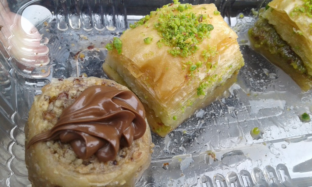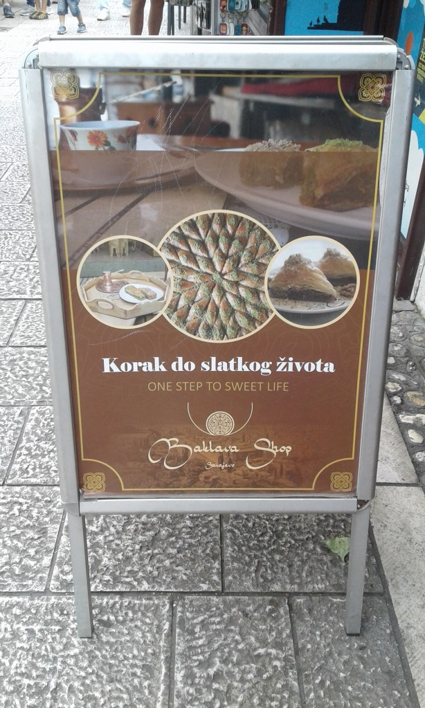Uma das delícias dos balcãs são as baklavas – que já conhecíamos de nossa viagem à Grécia. Elas são doces folhados banhados em mel e em Sarajevo os encontramos de todos os tipos! No Baklava Shop (Ćurčiluk veliki, 56) tinha baklavas com vários recheios diferentes: nozes, amêndoas, pistache, chocolate, nutella… A loja é uma perdição! Dá vontade de lamber a vitrine! Mas nos seguramos e compramos apenas uma embalagem com 4! Cada doce custa entre 2 e 3 BAM (conforme o sabor).