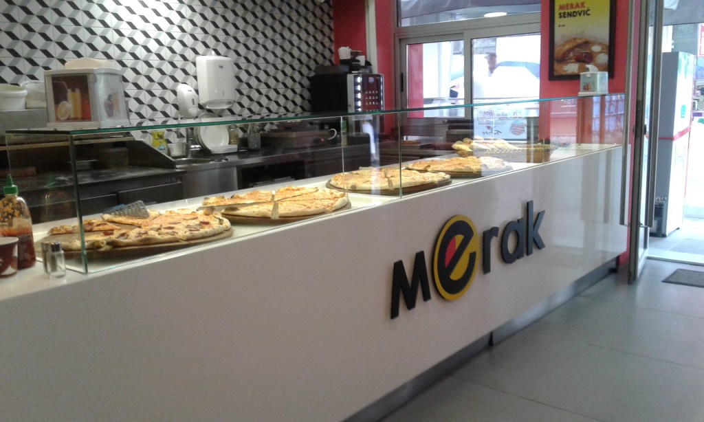 Já para uma pizza baratinha, saborosa e fresquinha, vá na Merak (Ferhadija, 35)! Pode-se comprar pizzas inteiras ou fatiadas. Comemos duas fatias e duas coca-colas por apenas 8,00 BAM!