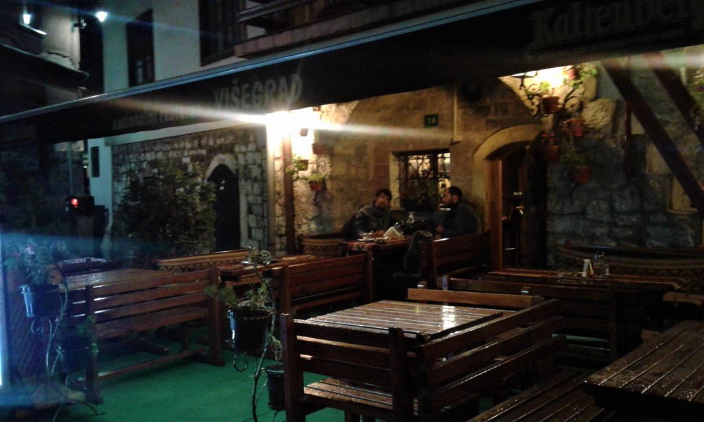 Ainda em Baščaršija, fomos a uma taberna de comida típica bósnia chamada Višegrad (rua Halači, 14) e adoramos! Um ambiente muito tradicional, em que os garçons atendem muito bem os clientes, mesmo quase sem entender inglês! (Suspeitamos que inclusive eram os próprios donos do local). Um casarão com o interior pintado de ocre, objetos de cobre e em uma das paredes uma grande gravura do Ditador Iugoslavo Tito nos dizem que ali o tempo parou. A comida estava ótima (provamos o Bosanski Lonac – ensopado bósnio) e raspamos os pratos! Recomendado para pessoas famintas e cansadas…