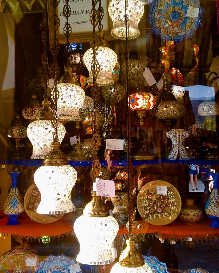 Comemos pimentões recheados com arroz e carne, acompanhados de coalhada e pão pita e salada. Uma delícia! Depois de almoçar, você ainda pode tomar um café turco, em um dos tradicionais conjuntos de cobre, na cafeteria ao lado (Slaticarna Divan) ou aproveitar para olhar as tapeçarias e as lindas luminárias do bazar. São caros pra chuchu, mas olhar não paga imposto, não é mesmo? Dica: diferentemente dos turcos, os bósnios não costumam e nem gostam de negociar preços. Assim, se o vendedor lhe disser que o produto custa X, não pechinche. Se gostou pague e leve. Não adianta chorar!
