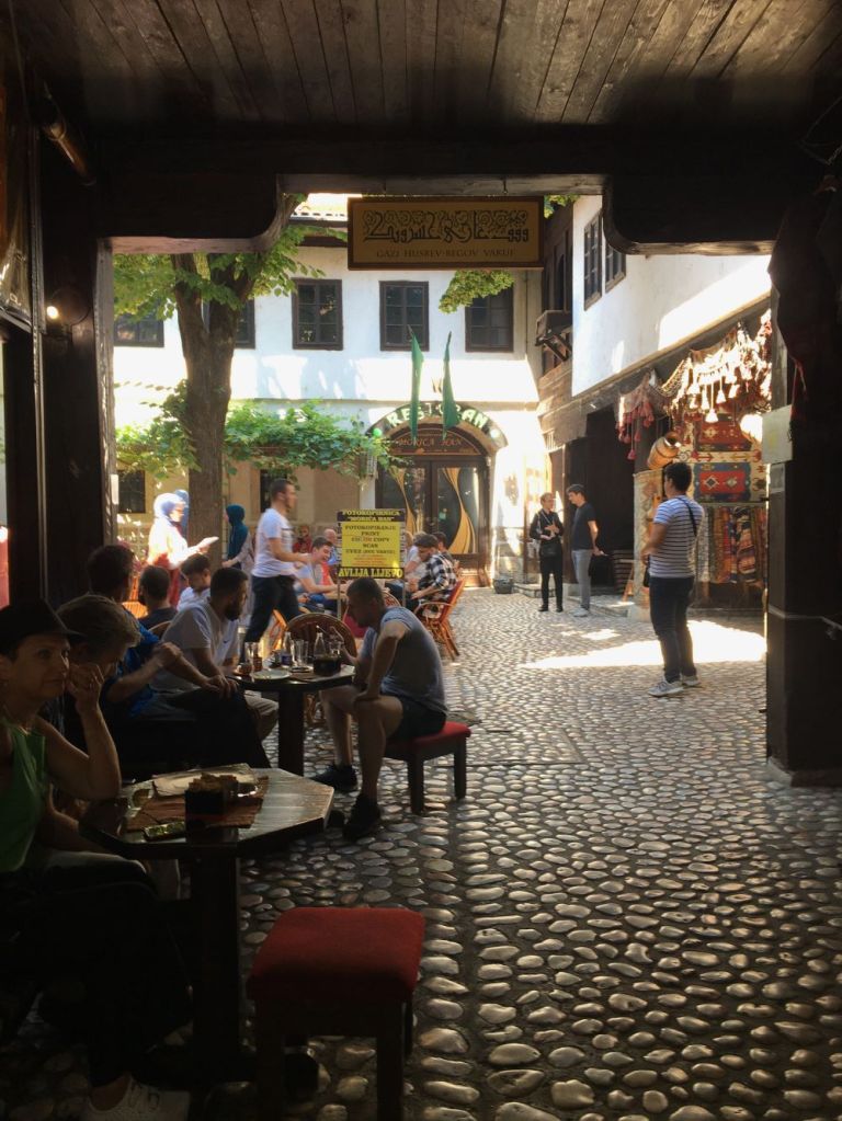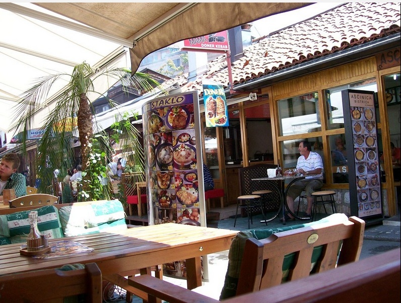 Para comer uma deliciosa comida bósnia em um ambiente histórico, mas bem tranquilo, nossa sugestão é o restaurante Moricá Han, que fica entre a fonte de Sebilj e a Mesquita Gazi Husrev-beg, na rua Sarači nº 77, em um pátio interno, longe do burburinho. É um lugar fresco, amplo e agradável e o espaço se divide entre o restaurante, o café e ainda um bazar. O edifício, construído em 1551 como um han (uma hospedaria de viajantes) é o único sobrevivente (inteiro) dos vários caravansarai (alojamento para caravanas) construídos durante o mandato do regente Gazi Husrev. Antigamente era feito de madeira e estuque e, mesmo tendo passado por vários incêndios, era sempre reconstruído. No seu auge o complexo podia abrigar até 300 hóspedes e 60 cavalos!