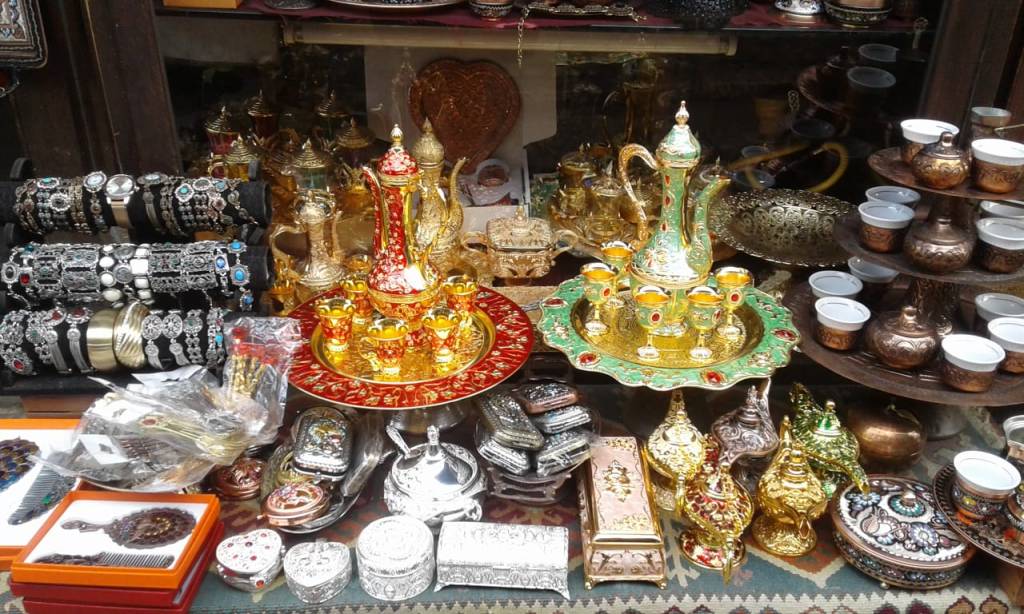São bandejas, jarras, moedores e conjuntos para café, adagas, narguilés e até canetas feitas com balas de fuzis! Tem de tudo!