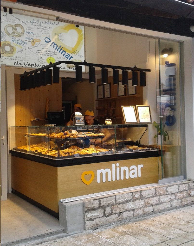 Mais um lugarzinho que gostamos foi a Pekarna (padaria) Mlinar (Maršala Tita, 60) que já conhecíamos de Ljubliana e de Dubrovnik . Há vários tipos de croissants doces e salgados, além de donuts e outras delícias. Era lá que comprávamos os saborosos rolinhos de canela para comer no café da manhã, por apenas 1,50 BAM cada um.