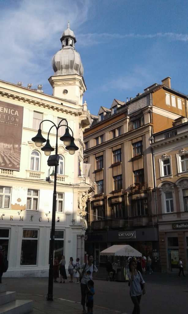 Saindo do Franz Ferdinand já demos de cara com a Ferhadija, a rua principal do centro. Uma inscrição no meio do calçamento (a rua é só para pedestres) simboliza o encontro de culturas e marca a divisão entre o lado oriental e o ocidental da cidade.
