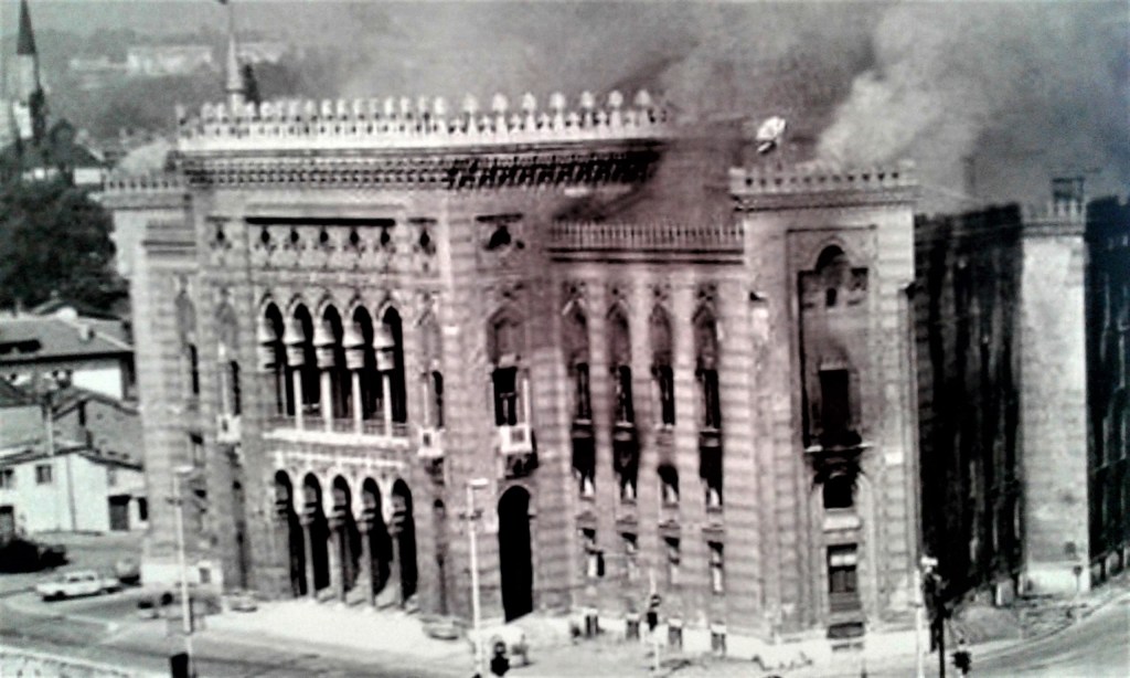 No início os ataques pesados visavam edifícios públicos e foi em um deles que a Vijećnica (prefeitura) foi queimada e 2 milhões de livros e manuscritos antigos foram perdidos. Vedran Smajlovic, um violoncelista bósnio, ficou famoso mundialmente por tocar sobre os escombros dias depois do bombardeio e relatar à imprensa internacional o que vivenciou. Ele tocou novamente na cerimônia de reinauguração da Vijećnica em 2014, desta vez para celebrar a vida e não para lamentar os mortos.