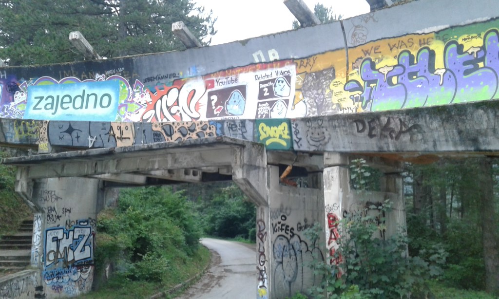 Na sequência paramos no antigo complexo dos Jogos Olímpicos de Inverno que aconteceram em Sarajevo em 1984. Durante a guerra os soldados sérvios usaram a pista de bobsleigh para posicionar seus atiradores de elite e alvejar os bósnios. Eles ficavam escondidos dentro dos muros da pista, onde faziam furos para colocar os canos das metralhadoras e rifles.
