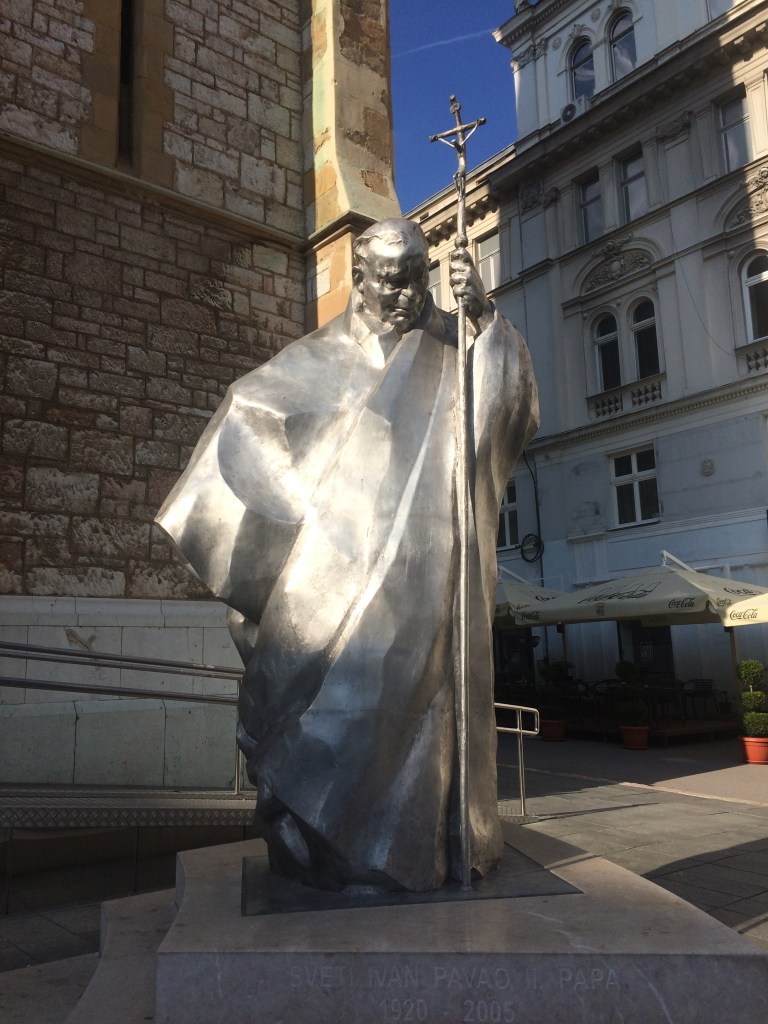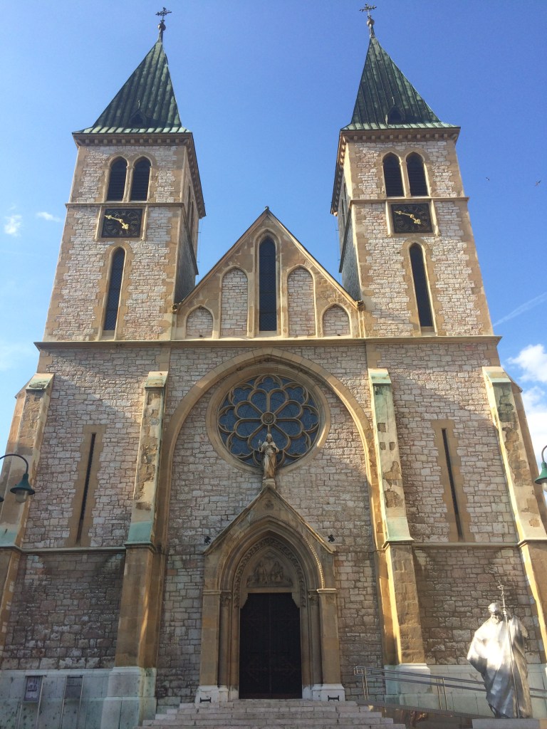 Encontramos o guia do Free Walking Tour às 10:00 da manhã em frente à Catedral do Sagrado Coração de Jesus (a igreja católica) que também fica na rua Ferhadija. Enquanto esperávamos, apreciamos o local. Como estava tendo celebração da missa não entramos, mas gostamos de ver a linda estátua de 3 metros de altura do Papa João Paulo II logo na entrada. Ela foi inaugurada em 2014 em homenagem ao papa que mobilizou a opinião pública em favor da paz na Bósnia.