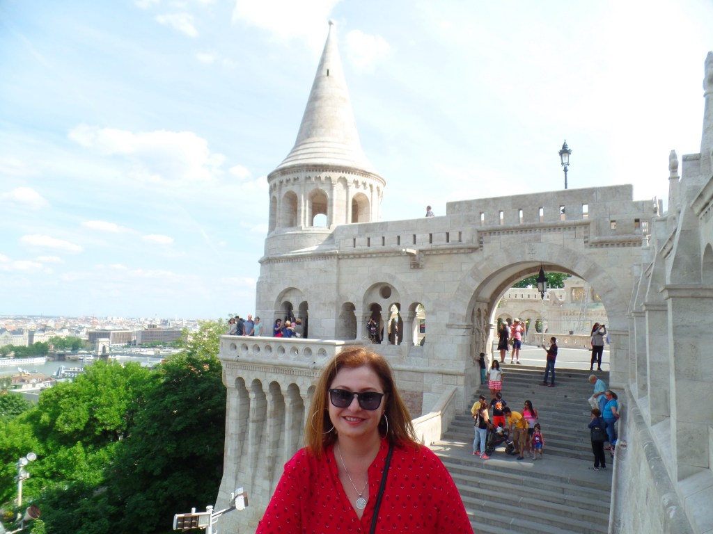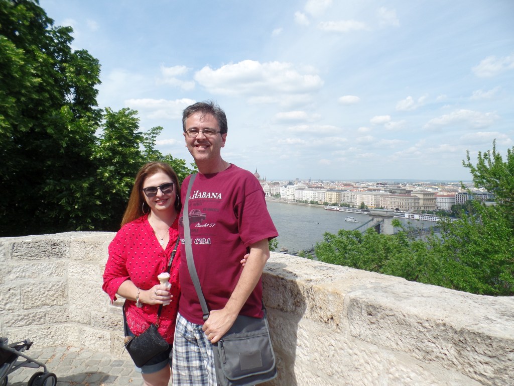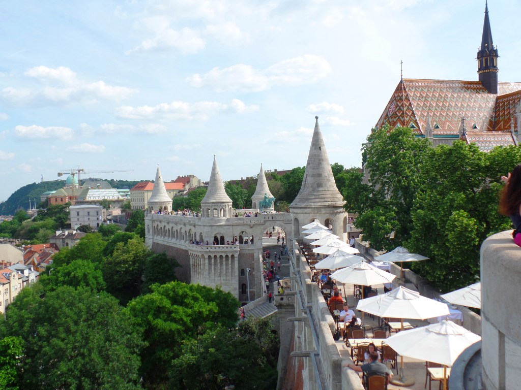 O Bastião dos Pescadores (Szentháromság tér) foi construído no século XIX para servir de Torre de Vigia, continua servindo seu propósito até hoje! Só que em vez de guardas, são centenas de turistas todos os dias! A vista de Peste a partir de suas torres é lindíssima. Uma delas é paga, a outra não. A diferença de vista entre ambas é mínima, portanto não é vantagem pagar. Após termos andado a manhã inteira pelo Castelo de Buda e visitado a magnífica Igreja de São Matias, estávamos cansados e com fome, assim, ali mesmo, paramos para almoçar no Café do Terraço. Comemos penne com molho parmesão e uma salada Ceasar e tomamos coca-cola e cerveja, tudo saiu por 8.859 florins – achei bem caro, mas, dada a localização, valeu a pena, pois nos rendeu ótimas fotos.