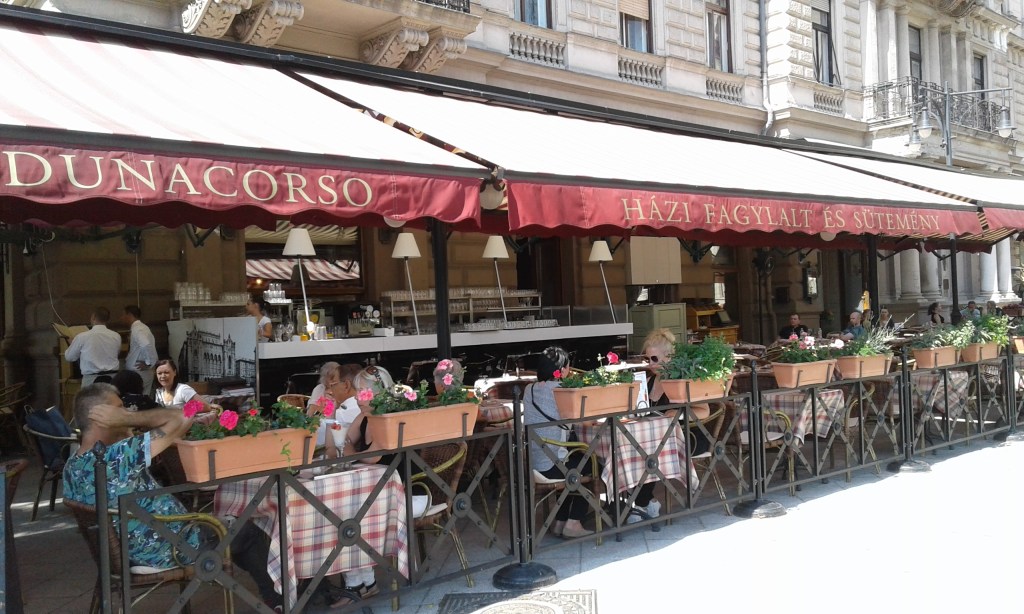 Almoçamos no restaurante Dunacorso (Vigadó tér 3), pois achamos o ambiente bem agradável, com mesas ao ar livre. Descobrimos depois que o lugar é muito tradicional, pois abriga restaurantes desde 1870. Este, em específico, pertence a mesma família há 40 anos. Como já esperávamos, os preços eram um pouco altos, por conta da localização privilegiada, mas a comida estava muito boa e o serviço foi rápido e eficiente. Comemos um frango com molho de páprica, acompanhado de spaetlze e um filet de peixe com aspargos, que veio com uma espécie de tortilla de batatas. O primeiro prato era bem servido, já o segundo não era generoso. Pedimos também uma taça de vinho da casa para cada um e uma garrafa de água mineral. Os pratos custaram 3.490 e 4.690 florins e o que encareceu bem a conta foi o vinho (1290 florins cada taça). Dica: se gostar, peça cerveja!