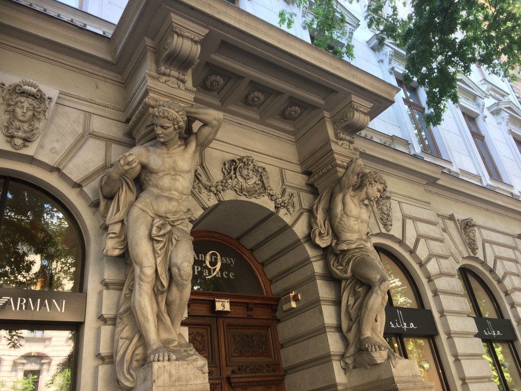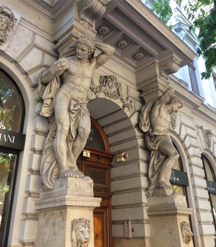 Parar em frente para tirar fotos delas é obrigatório! São realmente edifícios lindos, com suas Cariátides e Atlas sustentando os pórticos das entradas. Para olhos sensíveis, tornam-se invisíveis e banais as bolsas, sapatos, ternos e vestidos… Museu a céu aberto… e gratuito!