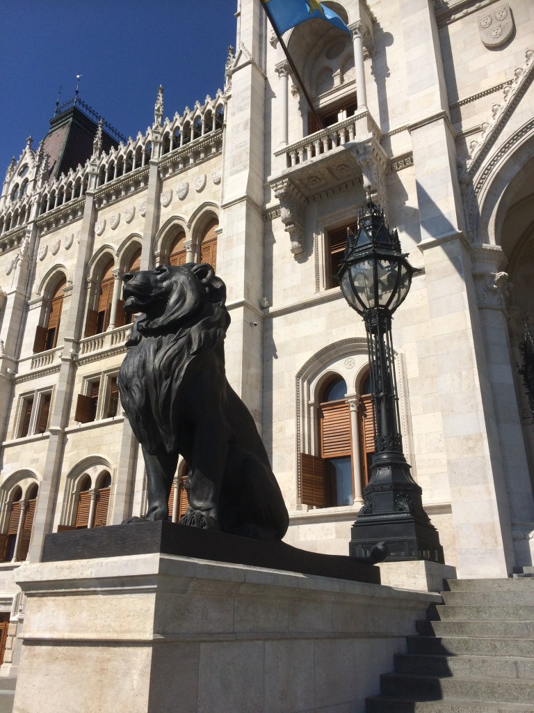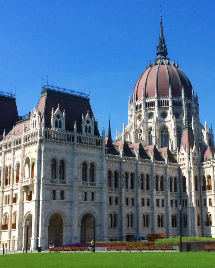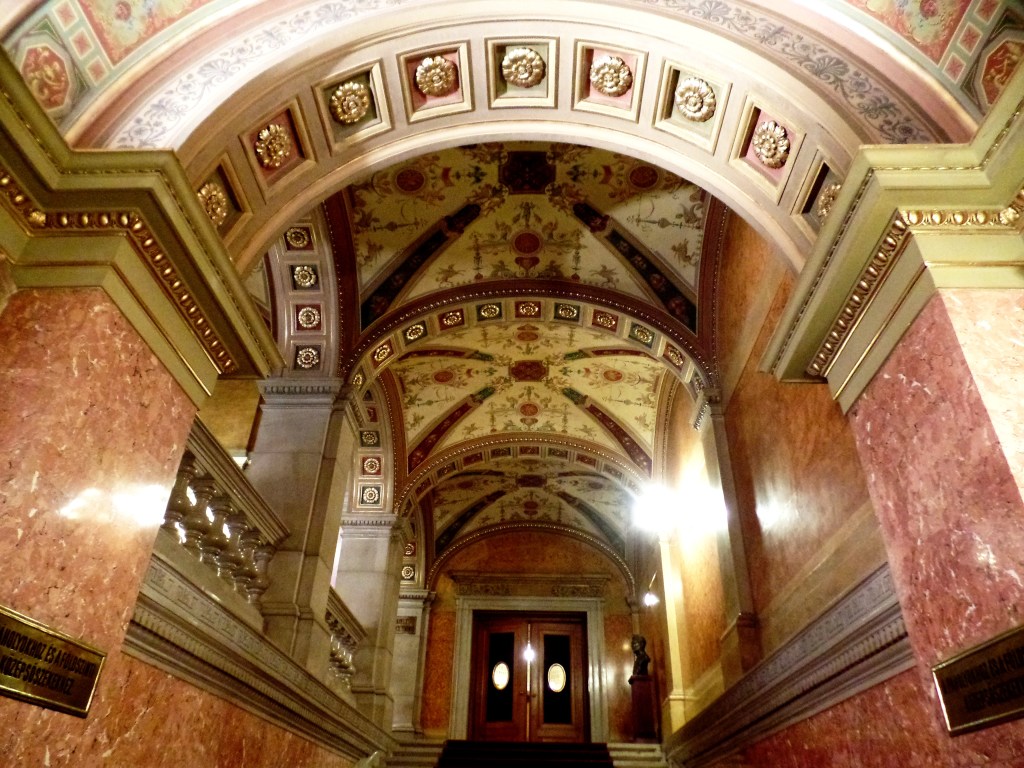 No dia seguinte pegamos novamente o Hop on & Off (afinal havíamos comprado o bilhete para 48hs) e descemos próximo ao Parlamento, na Kossuth Lajos tér 1-3 (parada nº 14). Com 96 metros de altura o Parlamento reina na paisagem de Budapeste. Inclusive, nenhum edifício na Hungria pode ter mais de 96 m (o número é uma referência à formação do Reino Húngaro no ano de 896). Seja visto a partir do Castelo de Buda, do passeio de barco pelo Danúbio ou ao visitá-lo, a imagem é sempre majestosa, durante o dia ou à noite. Inaugurado em 1896, o Országház é o maior edifício da Hungria e o segundo maior parlamento da Europa, com 700 salas.