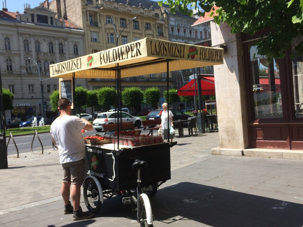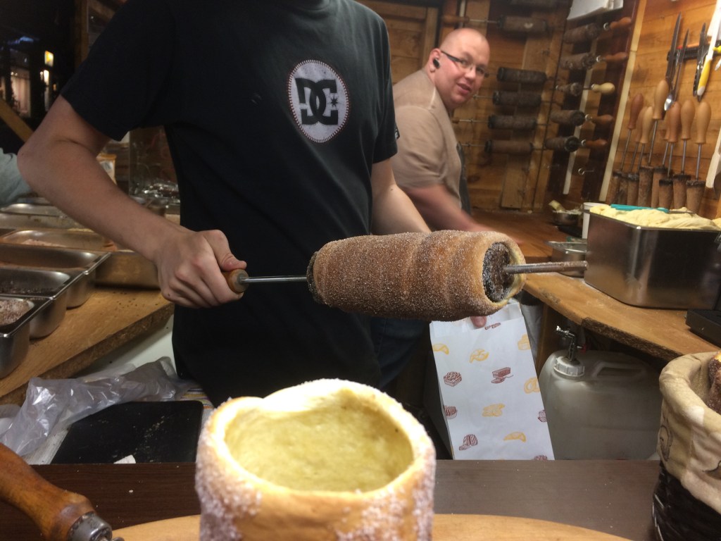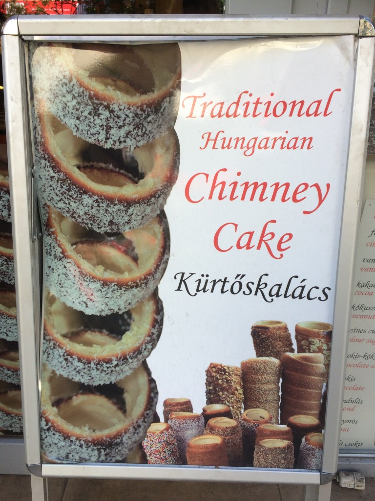 Caminhando pela Váci útca no fim do dia sentimos um cheirinho gostoso vindo de uma banquinha. Fomos conferir! Deliciosas tiras de pão doce assado na brasa, passado na manteiga e no açúcar – isso é o famoso Kürtőskalács que se encontra em vários lugares de Budapeste, pois dizem ser originário da Hungria, embora o tenhamos visto bastante na Romênia e também na República Tcheca.