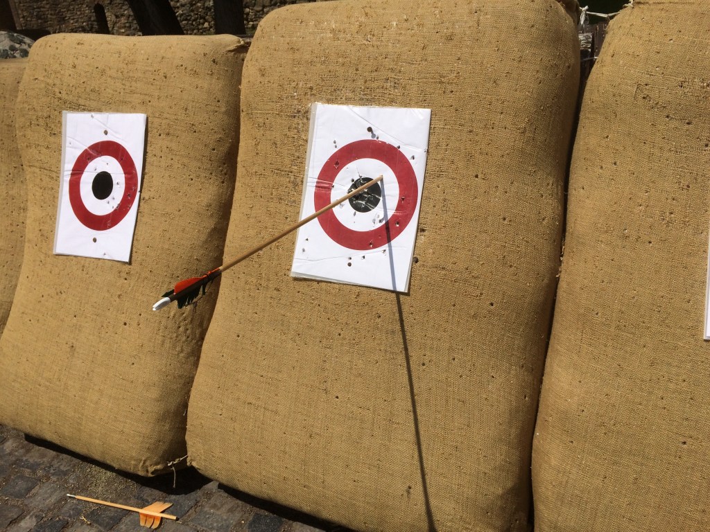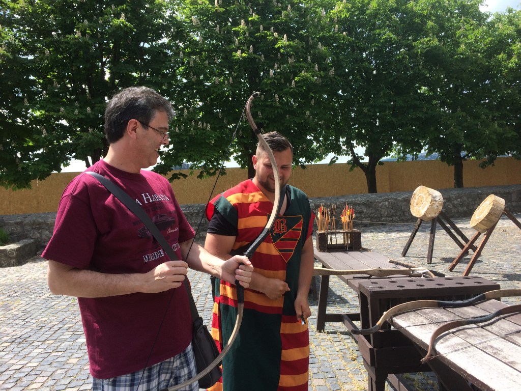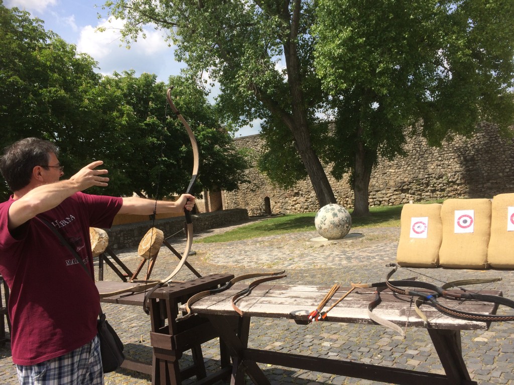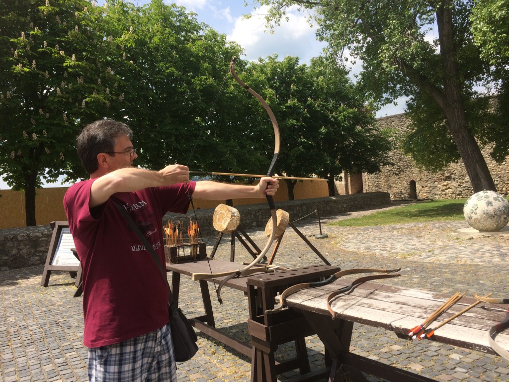 Quando fomos havia também um stand de arco e flecha que por 5 euros dava direito a três tiros. O Ede se divertiu muito com a brincadeira e, algumas tentativas e 10 euros depois, conseguiu até acertar alguns! O Castelo ainda tem terraços fantásticos de onde se tem uma vista privilegiada de Budapeste com a Erzsébet híd e o Parlamento ao fundo. De lá fomos a pé à Igreja de São Matias e ao Bastião dos Pescadores. Trata-se de um programa para um dia inteiro – não tenha pressa!