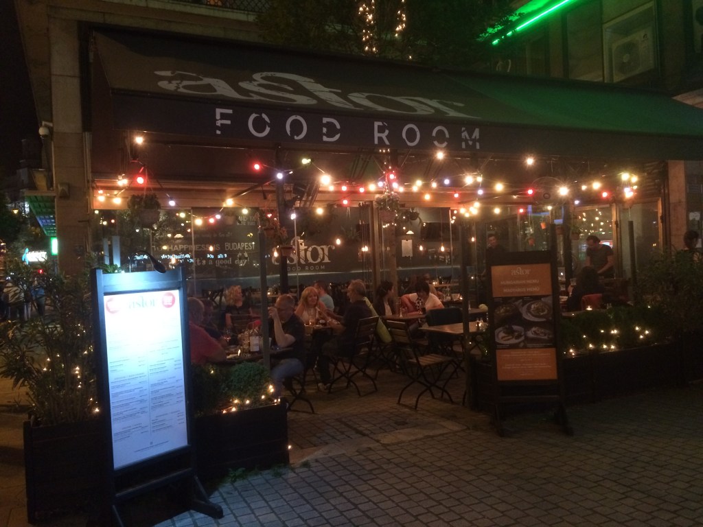 Passamos pelo Astor Food Room várias vezes e estava sempre bem movimentado. Resolvemos entrar para jantar um pouco mais cedo, enquanto ainda havia muitos lugares. Pedimos o pato rosé e um goulash. Para acompanhar duas taças de vinho tinto. O pato estava gostoso, mas um pouco duro e embora o prato tradicionalmente venha com a carne bem pouco cozida (rosé = rosado, ou seja, não é bem passado), deveria ser macio. Os acompanhamentos e o molho de frutas vermelhas estavam bons. O Ede se deu bem, pois pediu um goulash bem gostoso, embora já tivesse comido melhores e certamente bem mais baratos. O ambiente é bastante agradável e os garçons são rapazes bonitos e eficientes, mas não particularmente atenciosos. Ele é bem decorado e bacana por dentro, bem localizado (fica na Károly krt. 1), próximo ao hotel Astor, mas pode-se comer bem melhor em pequenos bistrôs no bairro judeu.