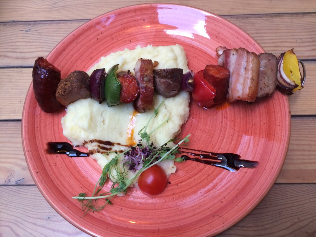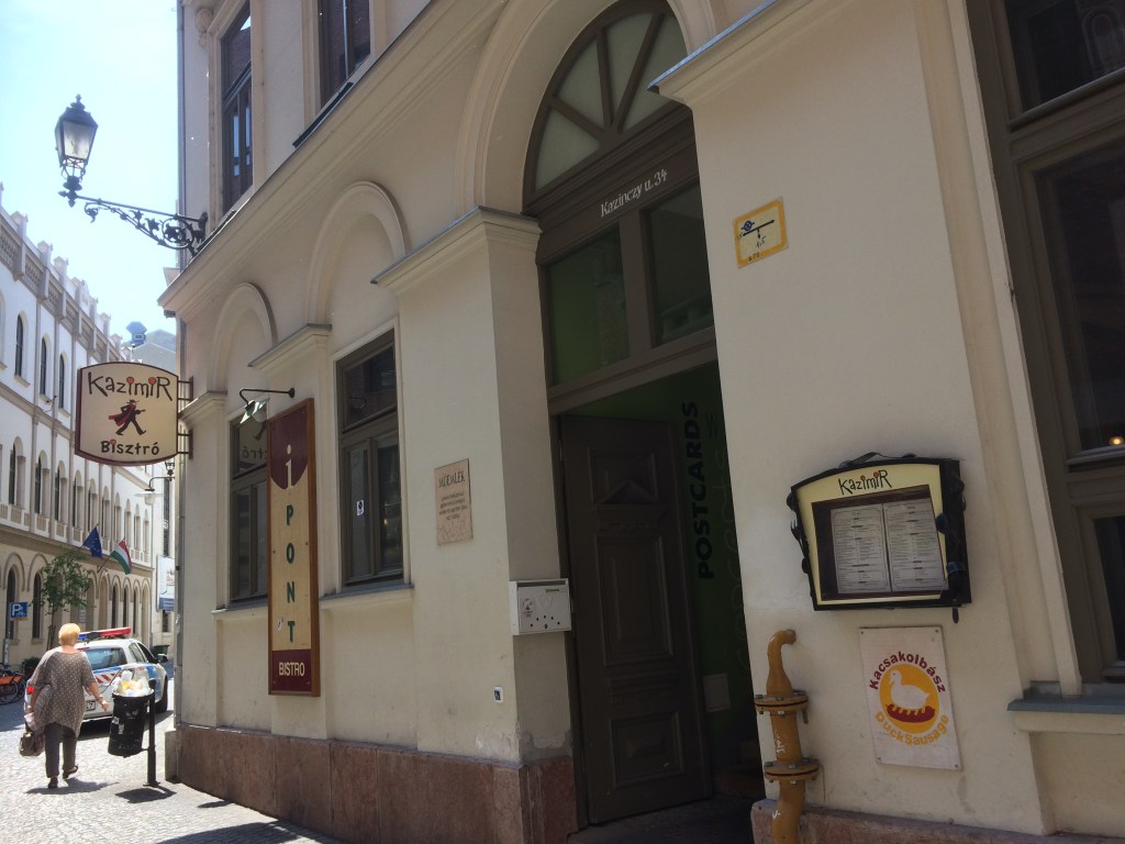 O Kazimir ficava muito perto de nosso hostel (Kazinczy u. 34) e passávamos sempre por ele. Em nossa última noite em Budapeste resolvemos comer lá, logo no começo da noite, para poder fazer uma última caminhada depois e dizer adeus à cidade. Tendo almoçado tarde, não estávamos com muita fome, assim, pedimos o queijo grelhado com salada, que estava realmente delicioso (é uma fatia grossa de queijo coalho grelhado e temperado) e também um espetinho misto (com carne de porco, linguiça, bacon e pimentões), também muito gostoso. Para beber, uma taça de vinho da casa e uma coca cola. O menu traz as opções também em inglês, o que facilita muito. Tudo saiu por 6.555 florins, cerca de 80 reais. Adoramos!