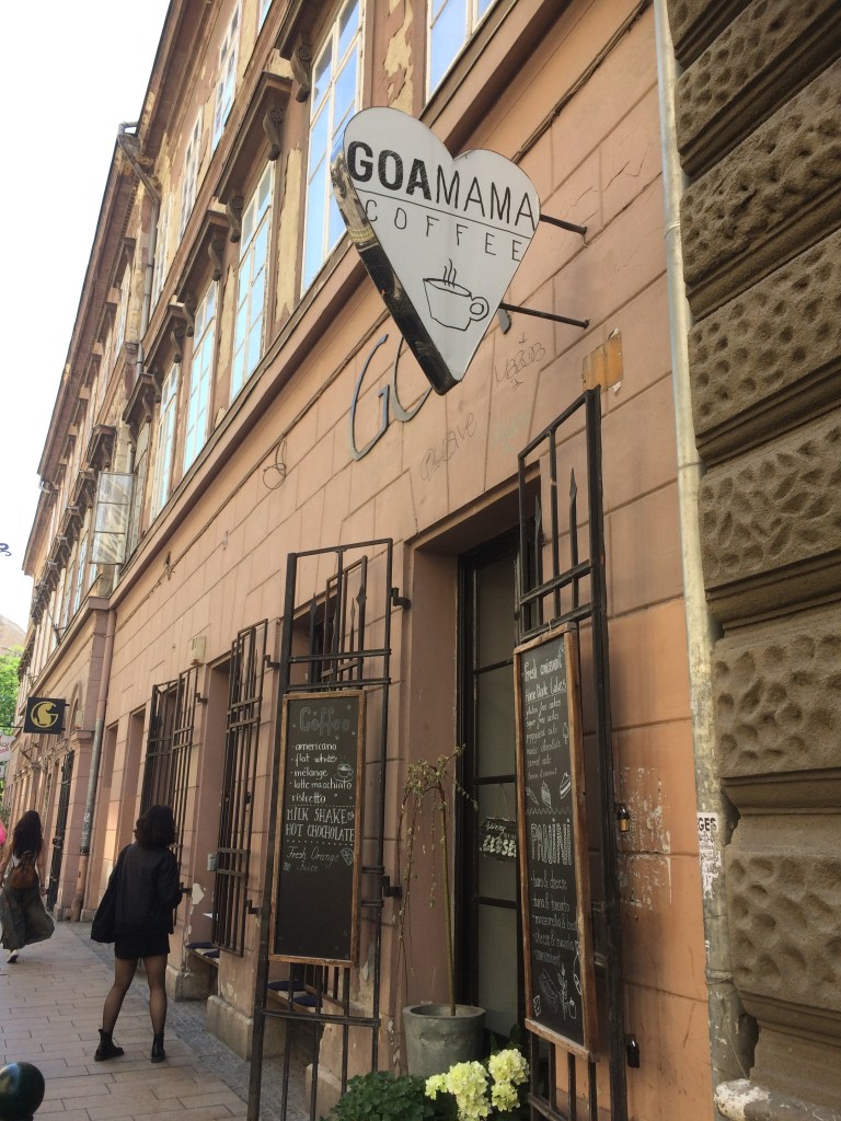 Último dia na cidade, andando pelo nosso bairro (Erzsébetváros) encontramos o Goamama, um pequeno e simpático Café na Király útca, que nos chamou a atenção pela decoração e pelo menu. Revolvemos entrar e tomar nosso café da manhã lá. Ótima escolha! O lugar é muito descolado e também tem peças lindas de louças e objetos de muito bom gosto para vender.