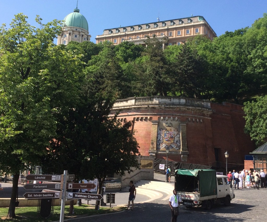 Finalmente chegamos à parada 10 do tour, o Funicular que leva ao topo do morro e ao Castelo de Buda. Quando chegamos à Szent György tér, a praça em frente ao Buda Hill Funicular, já havia uma fila imensa para comprar o bilhete e não havia funcionários da empresa organizando para que as pessoas não “furassem”. Esperamos bastante, mas conseguimos comprar os tickets. Cada carrinho comporta um número adequado de pessoas. Por sorte conseguimos embarcar no carrinho da frente e tivemos uma ótima vista da subida! O bilhete de subida e descida custa 1.800 florins por pessoa – cerca de 22 reais. De lá de cima vai-se ao Castelo, à Igreja de São Matias e ao Bastião dos Pescadores, à pé.