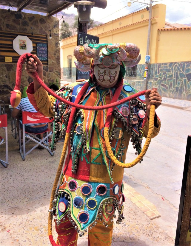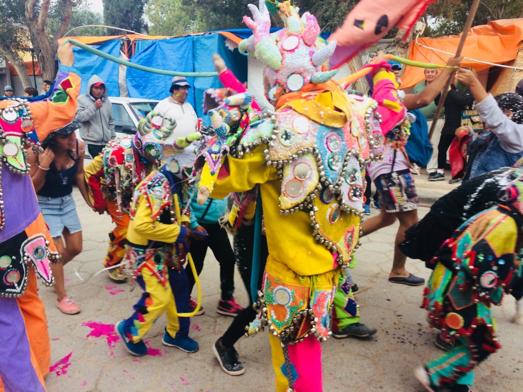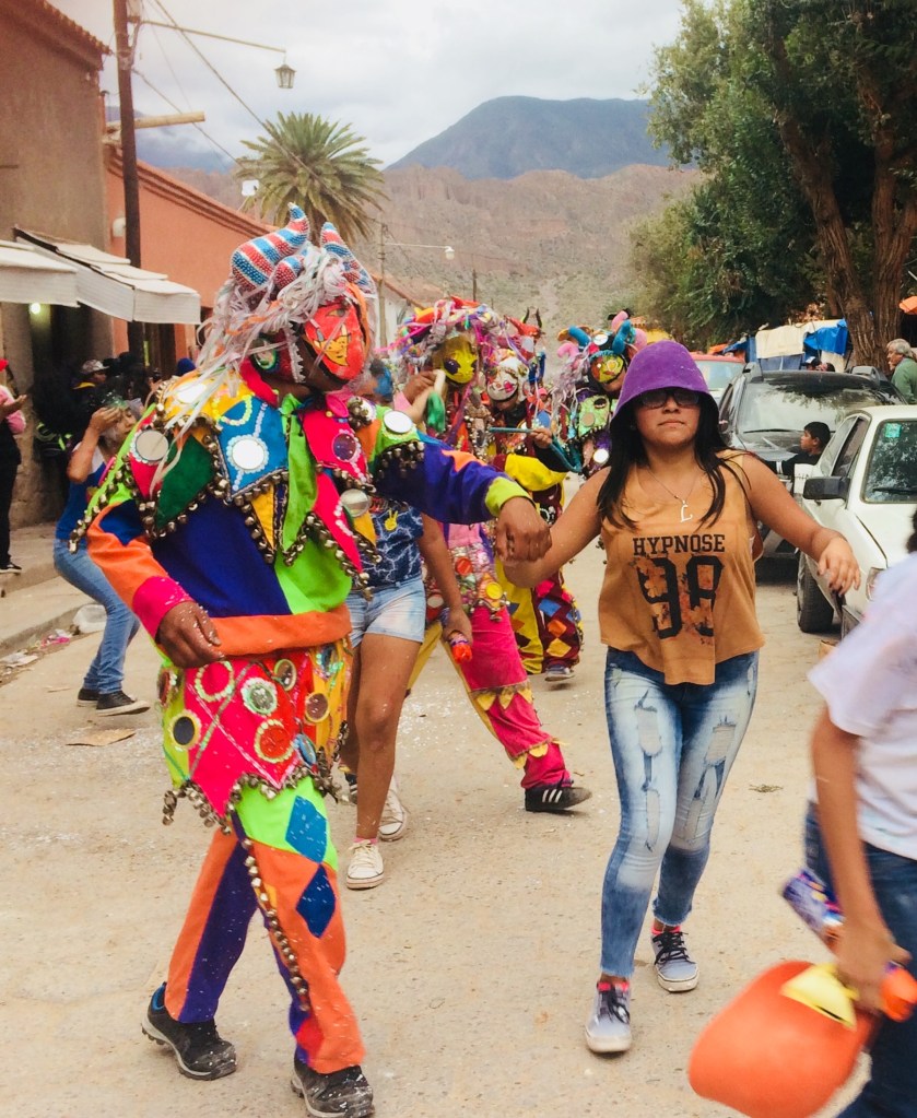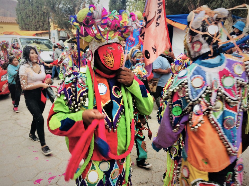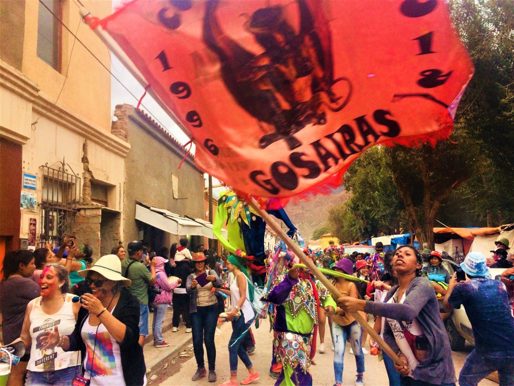 Assim como já tínhamos visto no Uruguai, por lá também tem desfile! As tradicionais “comparsas” – os nossos bloquinhos – desfilam por toda a Quebrada de Humahuaca no sábado, domingo e na segunda de Carnaval. Elas são várias e normalmente familiares e antigas, como a Comparsa Pecha Pechas, os Caprichosos de Tilcara, os Pocos Pero Locos, a Flor de Cardón Huichaira, os Paseanderos de Juella , los Gosairas, entre outras. Em Tilcara elas normalmente se reúnem no cerro para o desenterro e por lá ficam, fazendo festa.