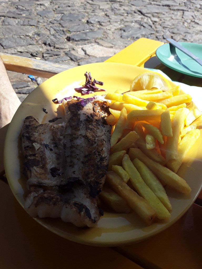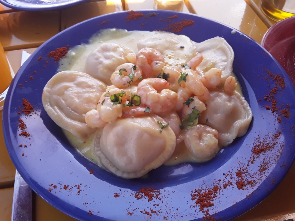 Na calle Misiones de los Tapes, bem no miolo da Cidade Velha, almoçamos no Buenos Amigos, que é bem turístico, mas não deixa de ser muito gostoso. Estávamos com fome e comemos muito bem, a dica é só ficar de olho nas massas e molhos na hora de pedir. Eu escolhi os sorrentinos e como não disse que molho queria, veio sem nada. Pedi o molho com camarões separado, depois (o valor também é separado), mas estava uma delícia. Escolhemos também o filé de peixe com batatas fritas e uma salada caprichada, vinho e suco de laranja e comemos tudo até a última migalha. O lugar é muito tradicional.