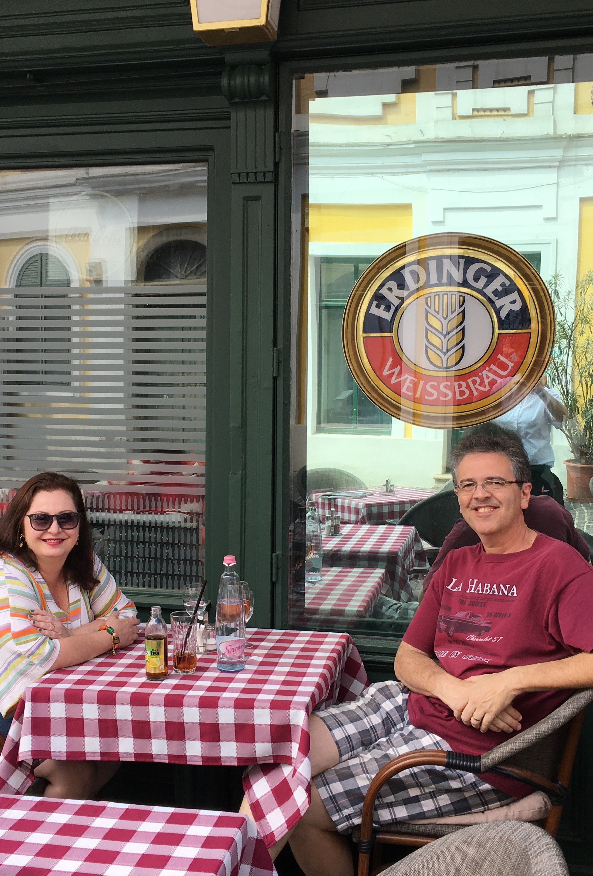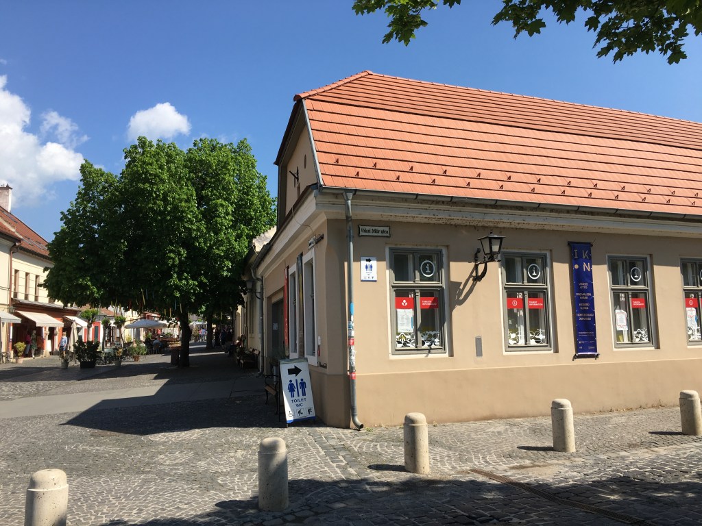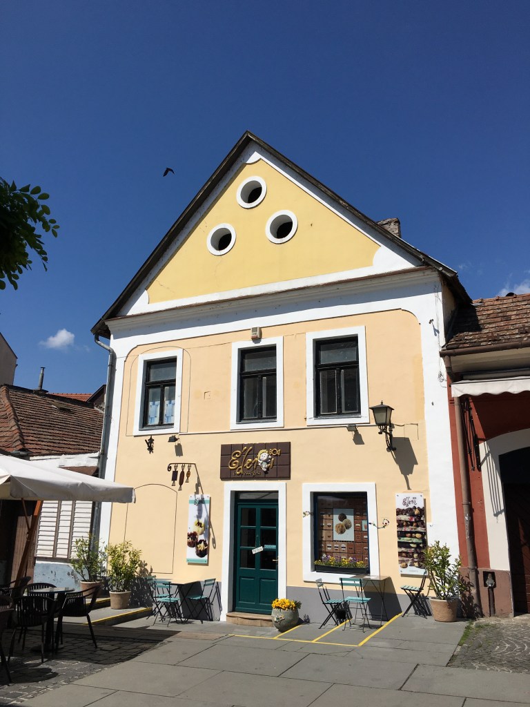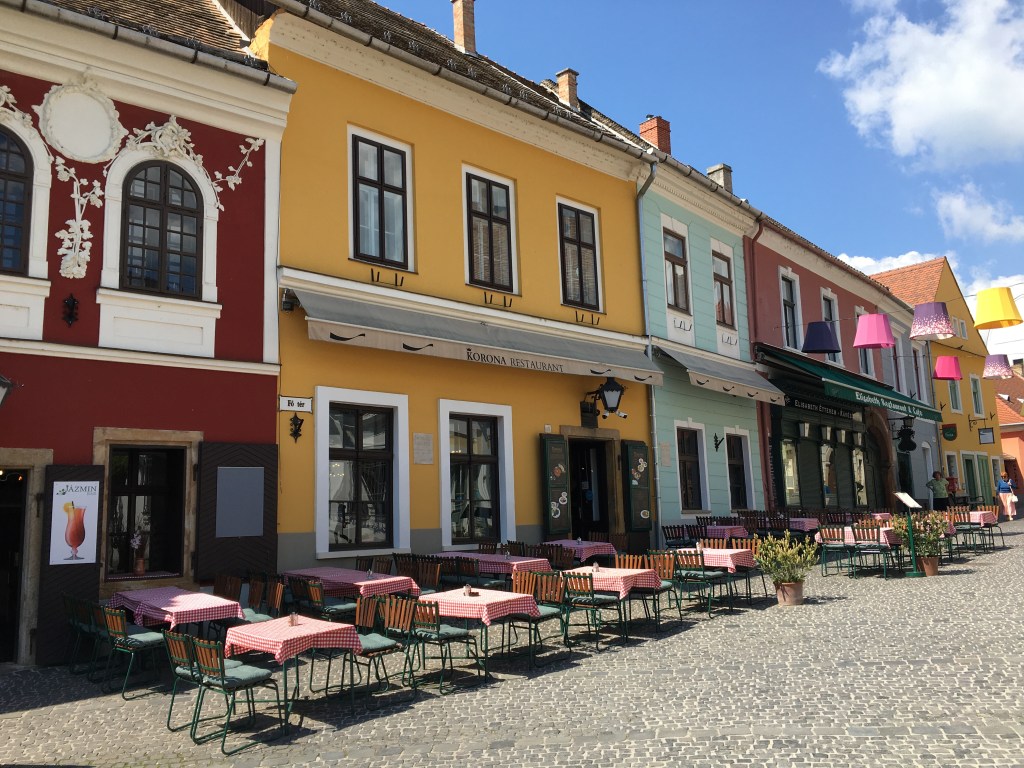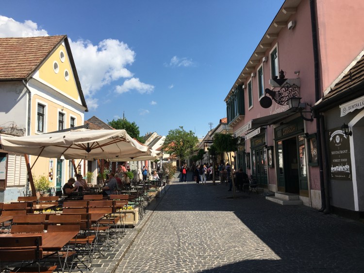 A comida é gostosa e os preços são como os de Budapeste. Almoçamos no Elisabeth Café, bem em frente à praça (Fö tér, 17). O lugar tem mesas na calçada e o atendimento foi legal pois a garçonete falava um pouco de inglês. O carro chefe do restaurante é o frango e os pratos estavam bons. De sobremesa pedimos uma crépe de Nutella e ainda voltamos lá no caminho da estação e paramos para um café gelado antes de ir embora.