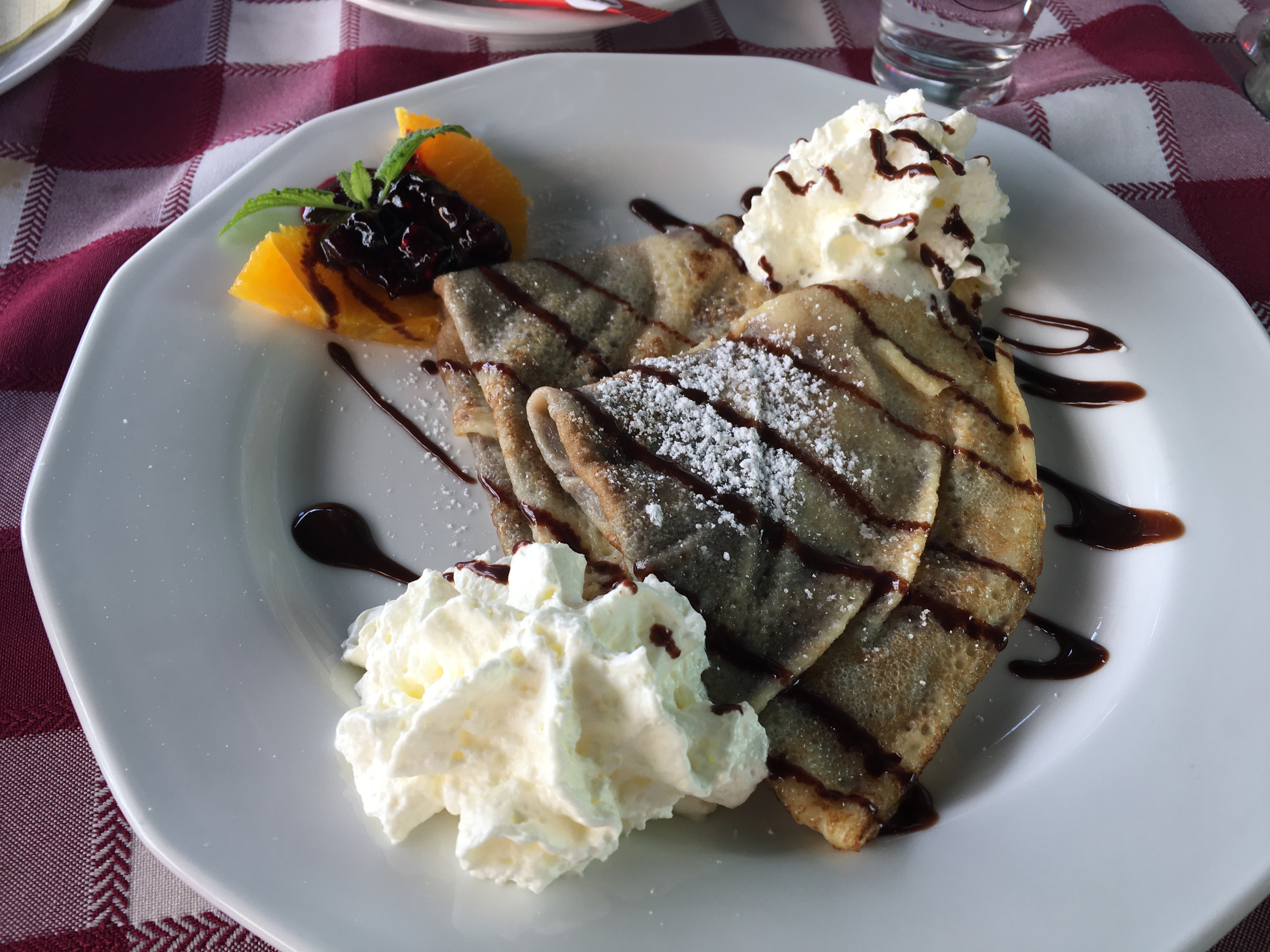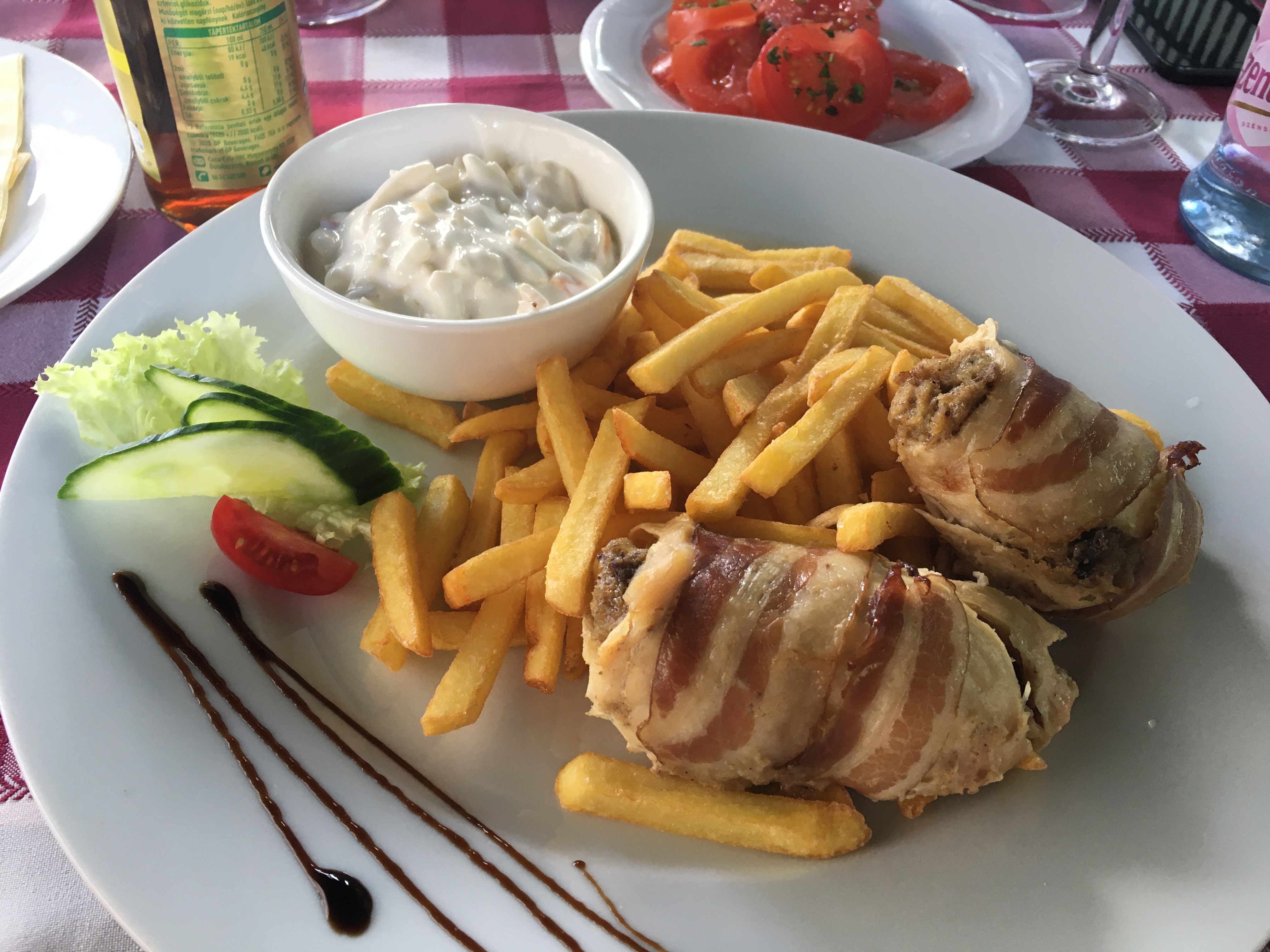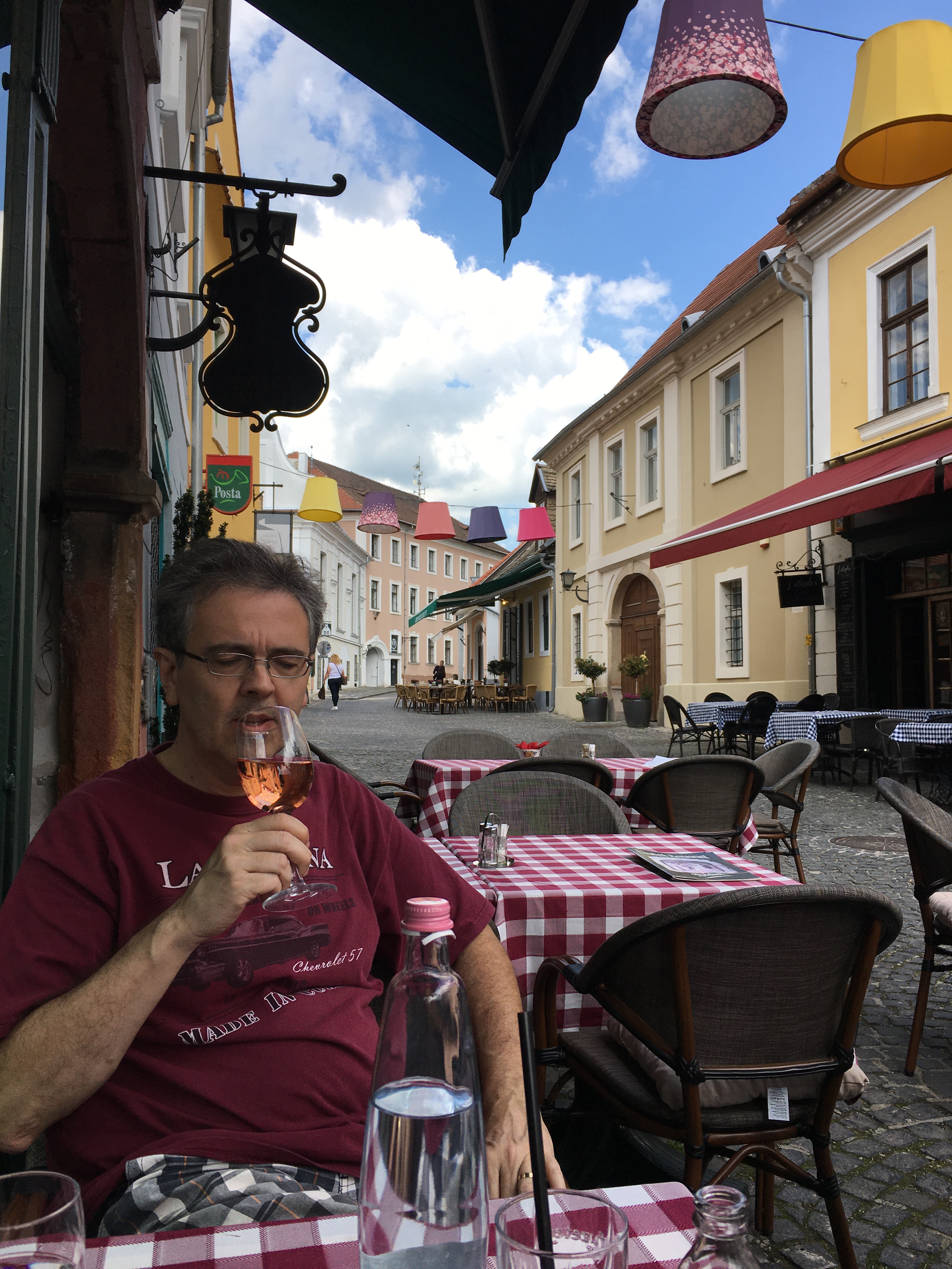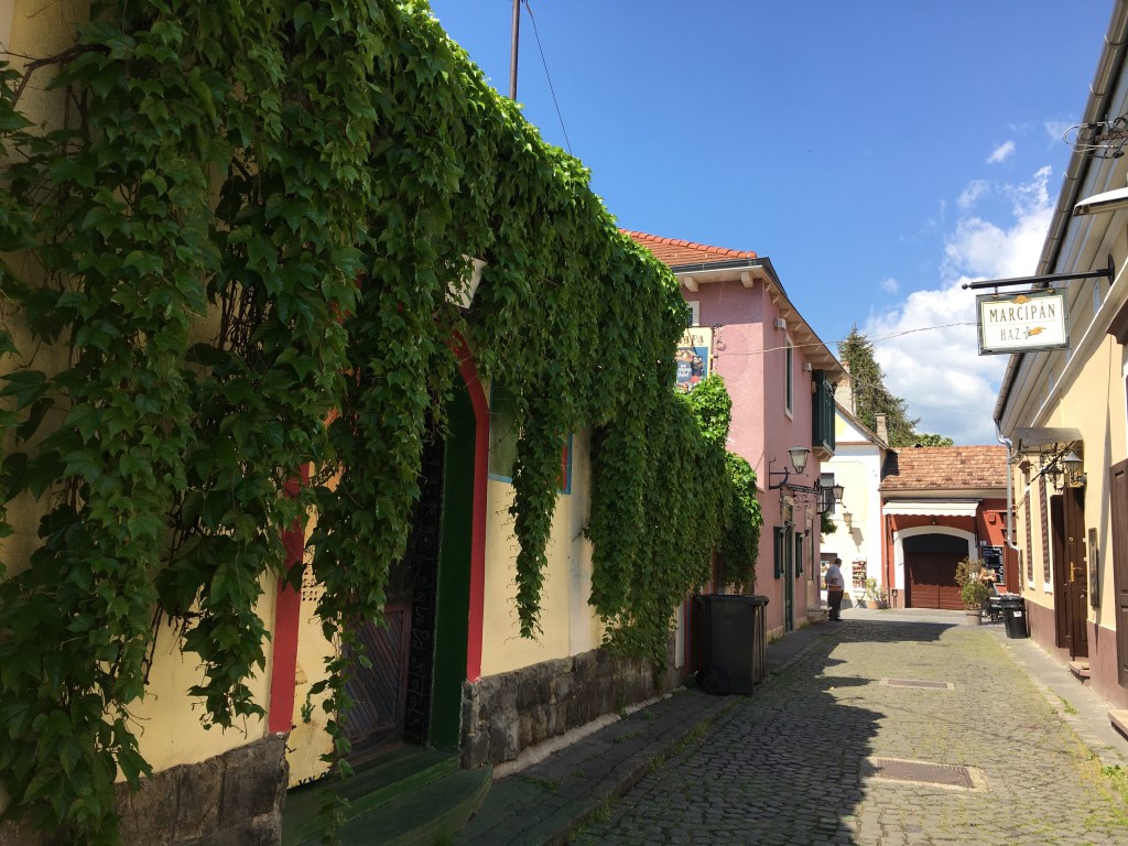 A comida é gostosa e os preços são como os de Budapeste. Almoçamos no Elisabeth Café, bem em frente à praça (Fö tér, 17). O lugar tem mesas na calçada e o atendimento foi legal pois a garçonete falava um pouco de inglês. O carro chefe do restaurante é o frango e os pratos estavam bons. De sobremesa pedimos uma crépe de Nutella e ainda voltamos lá no caminho da estação e paramos para um café gelado antes de ir embora.