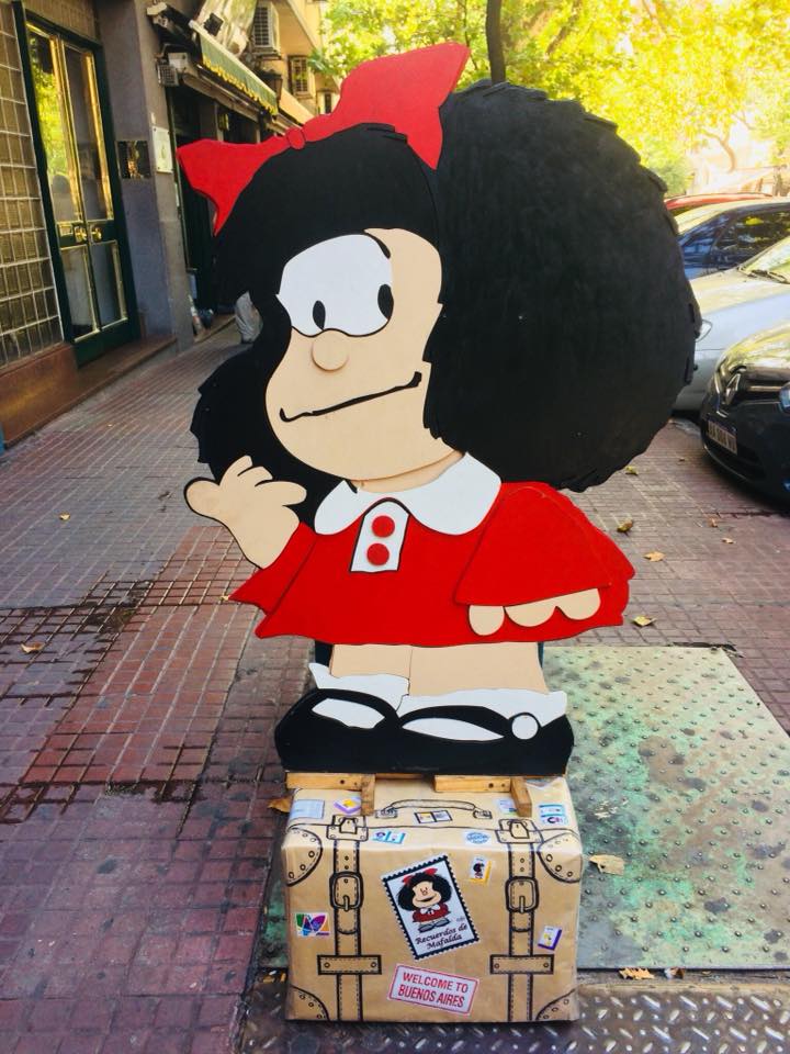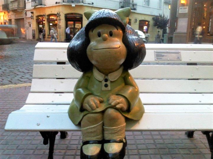 Perto dali, na esquina da rua Chile com a Defensa está o famoso monumento à Mafalda, personagem dos quadrinhos do cartunista argentino Quino (que viveu em San Telmo). Mafalda ficou famosa porque era contestadora e fazia duras críticas sociais durante os anos 60. Com muito bom humor e inocência, odiando sopa e amando os Beatles, fez muita gente pensar. É comum ter bastante gente em volta da estátua e você precisar esperar a sua vez para tirar uma foto. Mas é icônico! Mafalda tem mais de 50 anos e ainda é muito atual. Vale comprar uns quadrinhos também!