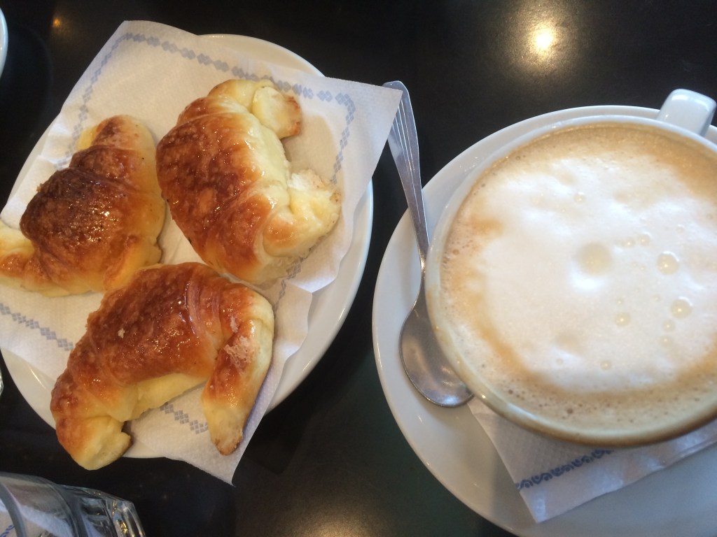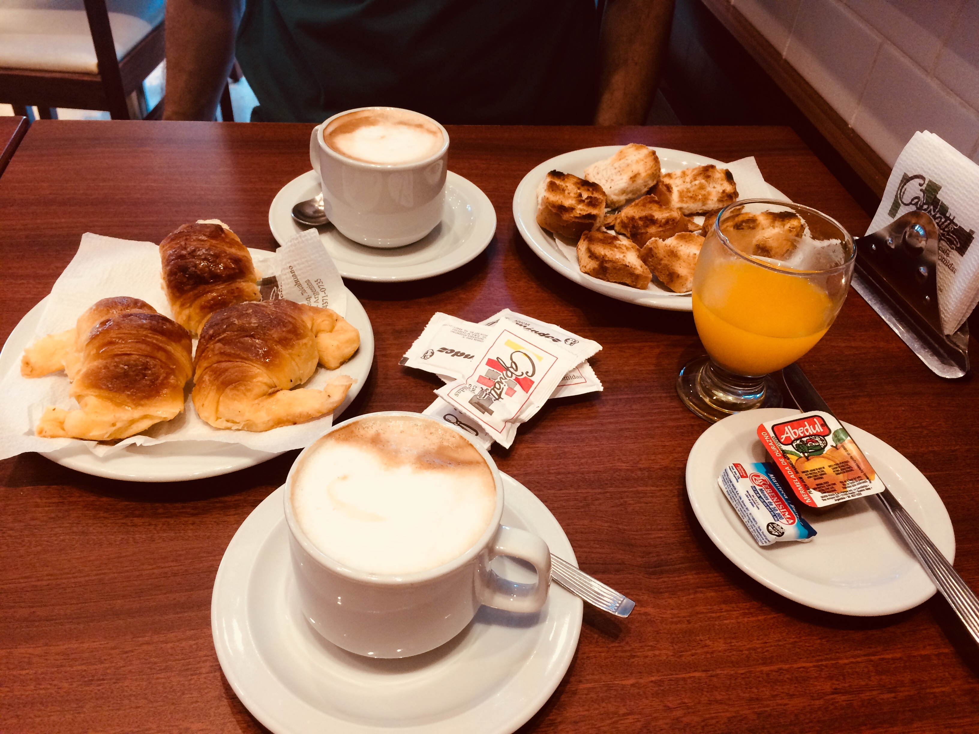 Pra fugir do café da manhã caro do Ibis Obelisco, logo na esquina está o Café Capriatti, que tem várias opções. Costumávamos tomar café da manhã lá em nossa viagem de 2016 e o fizemos novamente agora. Café com leite, tostadas ou media lunas, manteiga, geleia e suco de laranja, além de poder dar uma olhadinha no jornal ou discutir as notícias da TV com os garçons. Econômico e agradável.