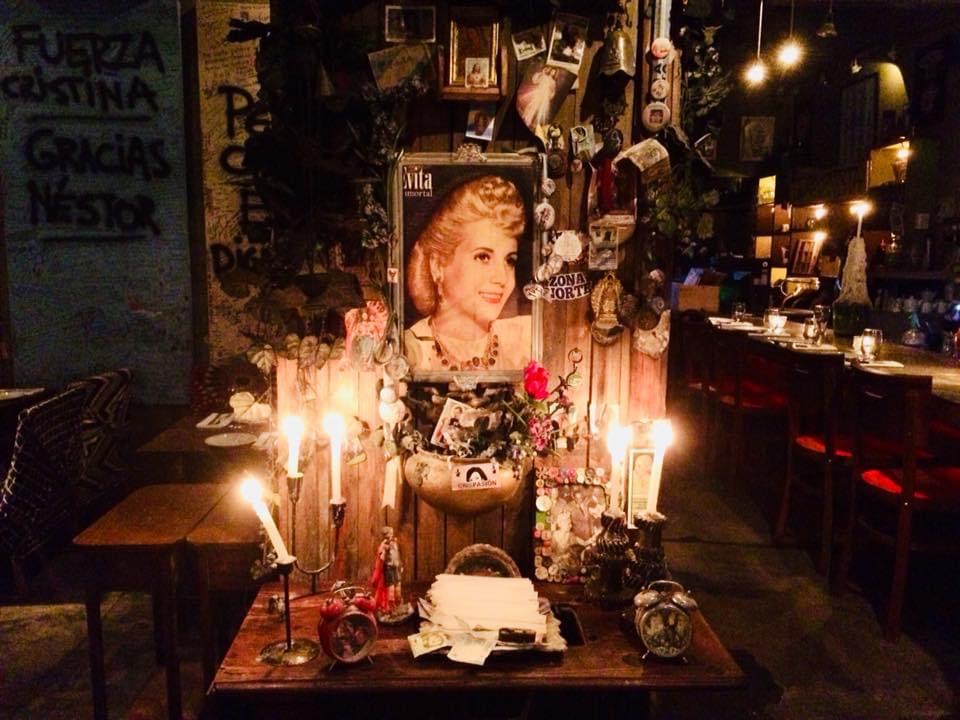Foi ao som do hino peronista, que ecoa pelo bar a cada uma hora, que jantamos. Chegamos cedo (às 20:00) e foi possível escolher uma boa mesa nos ambientar para esperar por nossos amigos… depois das 21:00, entretanto, o lugar lotou e a festa começou. Achamos muito divertido e gostamos das homenagens. Muitos quadros nas paredes e em meio às mesas um lindo altar para Evita completa o cenário. A comida também estava muito boa (comemos a Bondiola Braden, além de um prato de polenta cremosa com cogumelos grelhados). As bebidas tem nomes muito criativos, como Descamisado, Capitana e Néstor Vive. O El Perón Perón fica na Calle Angel Justiniano Carranza 2225, em Palermo Hollywood. Adoramos!