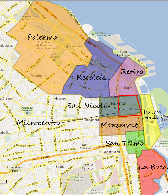 O bairro chamado Microcentro fica entre quatro grandes avenidas (Mayo, Córdoba, 9 de Julio e Leandro N. Alem) e concentra vários pontos turísticos como a Calle Florida, Galerias Pacífico, Casa Rosada, Obelisco, Café Tortoni e Plaza de Mayo.