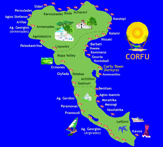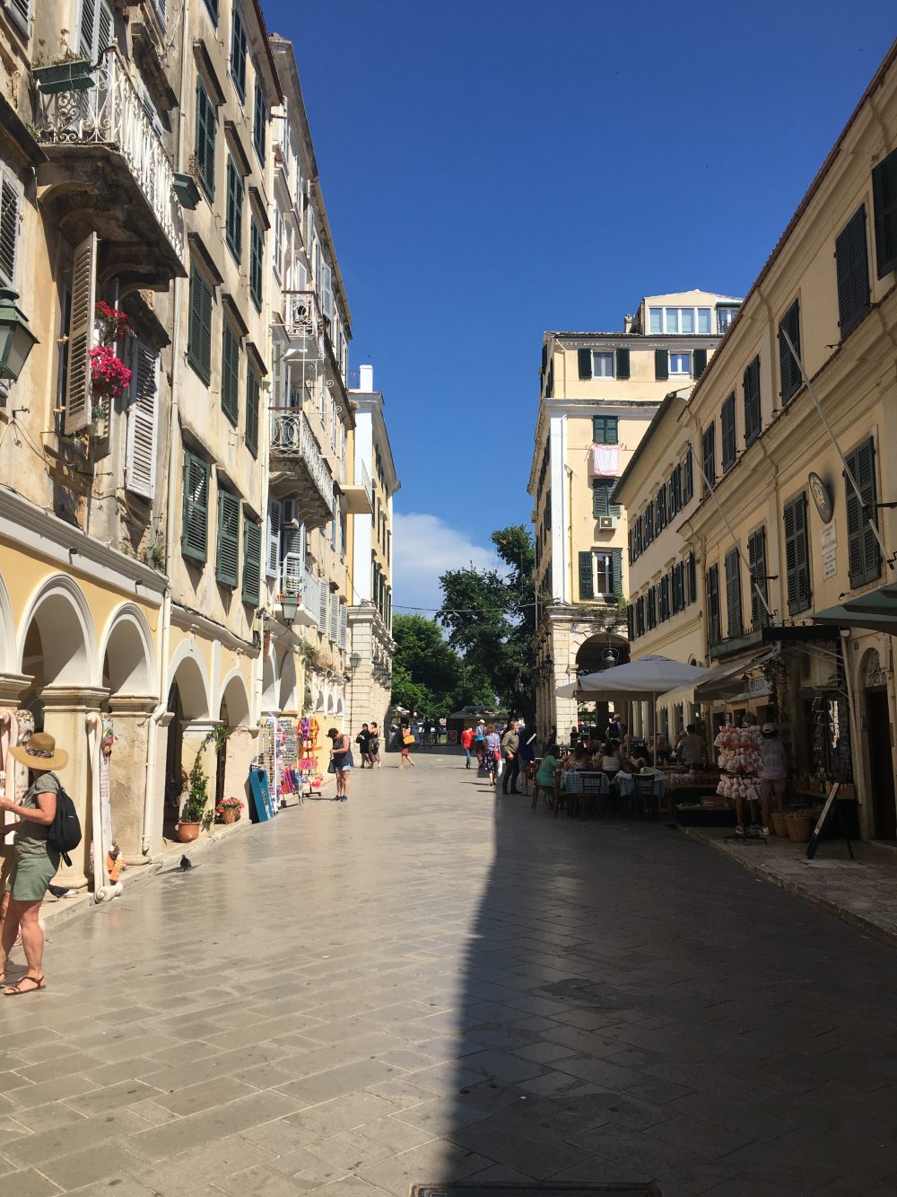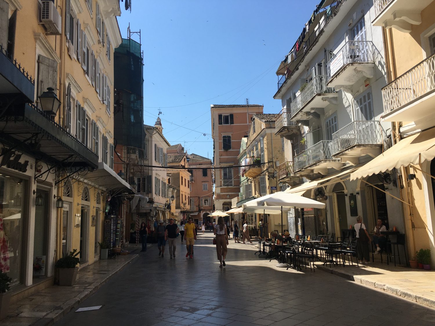 O estereótipo da ilha com casinhas brancas de teto azul é quebrado em Corfu. O fato de nunca ter sido ocupada pelos turcos otomanos, diferente do resto da Grécia, se reflete em sua arquitetura, palácios, casarões, igrejas, calçadões, ruelas e becos com cara de Itália. Nas ruas antigas viveram famosos artistas, cantores, compositores, princesas, poetas gregos, italianos e franceses. Hoje a cidade tem cerca de 40 mil habitantes, sem contar o grande número de estudantes que frequentam a Universidade Jônica e que são moradores temporários.