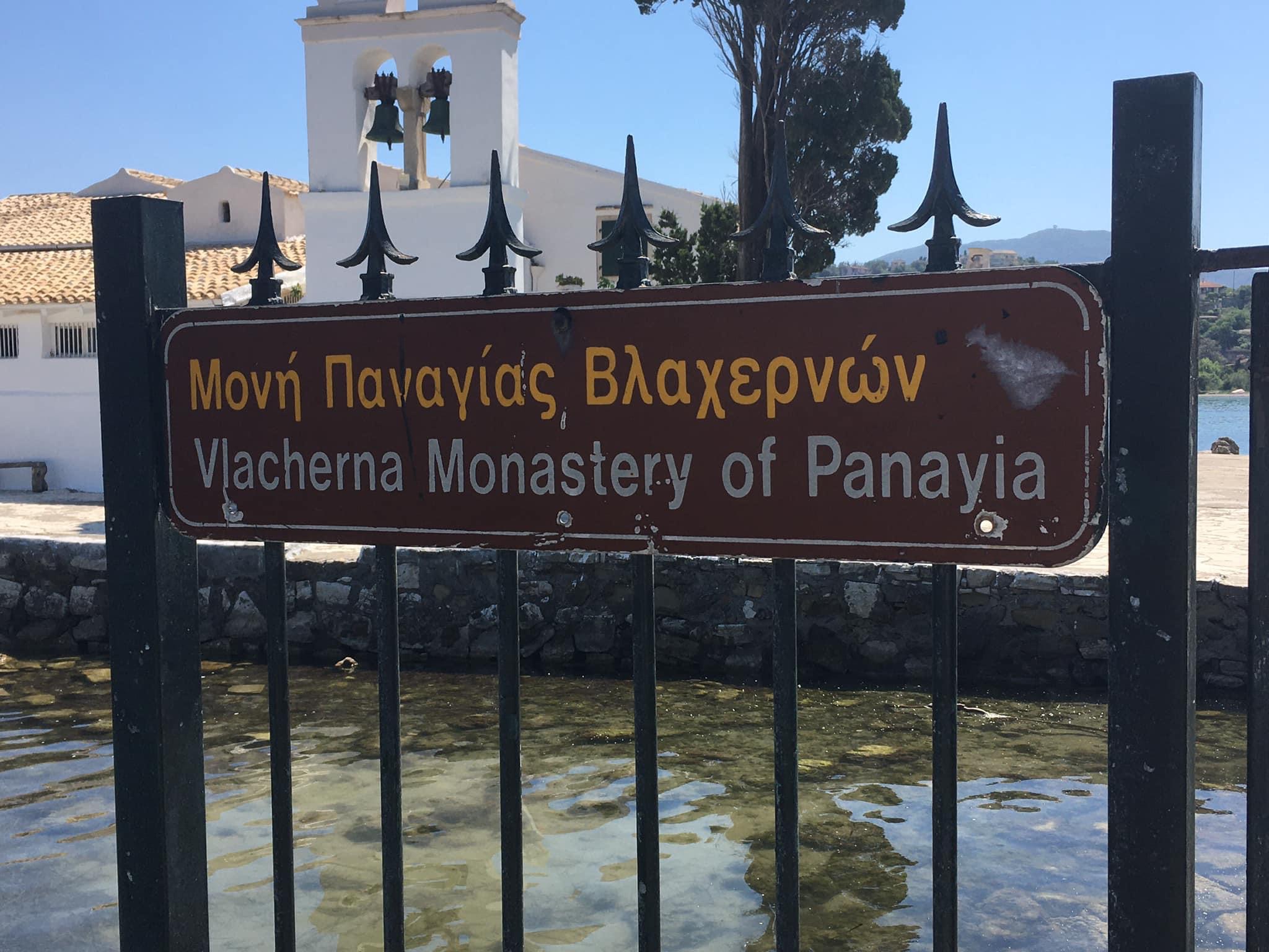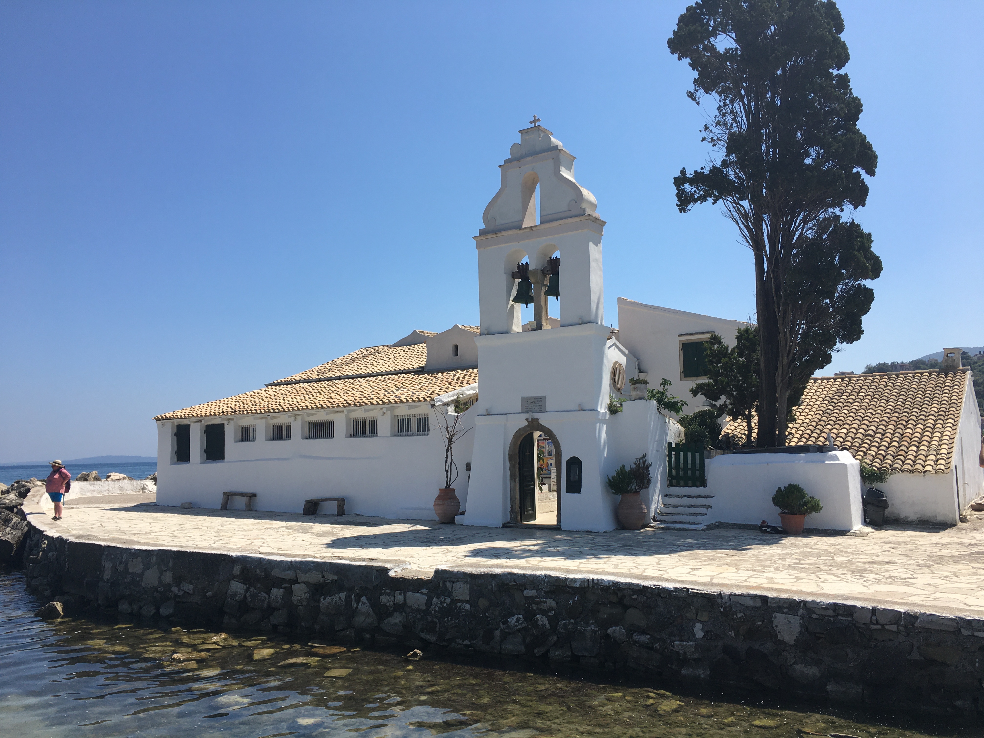 O mosteiro de Panagia Vlacherna ao sul da Cidade Velha é um ícone de Corfu. É pequeno, mas fica em plena baía e o lugar é muito bonito. A ilha também tem um aeroporto e uma das atrações é ir até lá para ver os aviões passarem literalmente, por cima das nossas cabeças. Fizemos isso com o nosso guia e aproveitamos para tomar mais um sorvete no The Royal depois de ver o mosteiro.