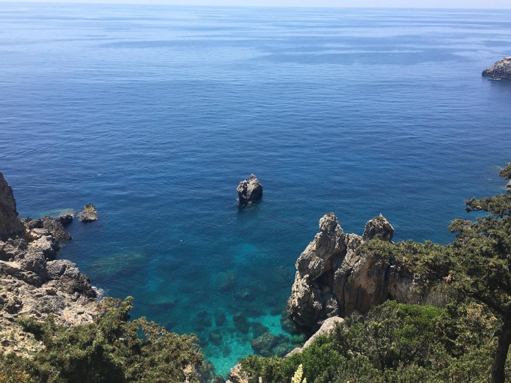 Mais ao norte da ilha fica a linda baía de Paleokastritsa. Lá visitamos o mosteiro de Theotokos Paleokastritsa, que é de 1228. Ele é pequeno e bem preservado. A manutenção é feita há séculos pelos fiéis da irmandade das aldeias de Lakones, Krini, Makrades e Liapades. Ele fica no alto do penhasco e tem-se uma linda vista das rochas caindo sobre o mar.
