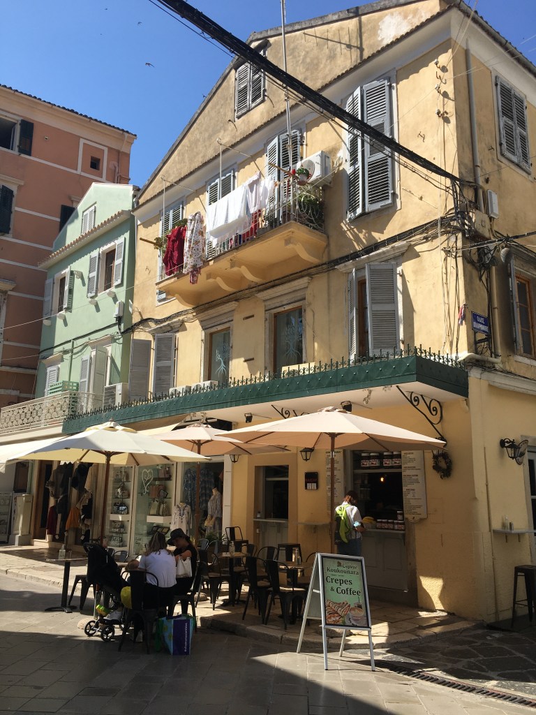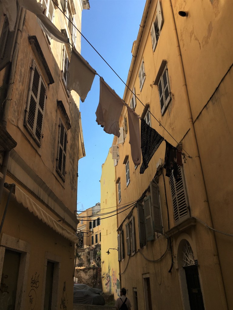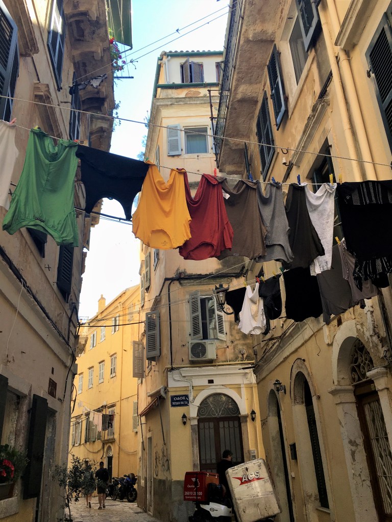 Corfu é o único local da Grécia que, como na Itália, os moradores têm hábito de estender roupas lavadas do lado de fora da janela ou espalhar varais de uma varanda para outra.