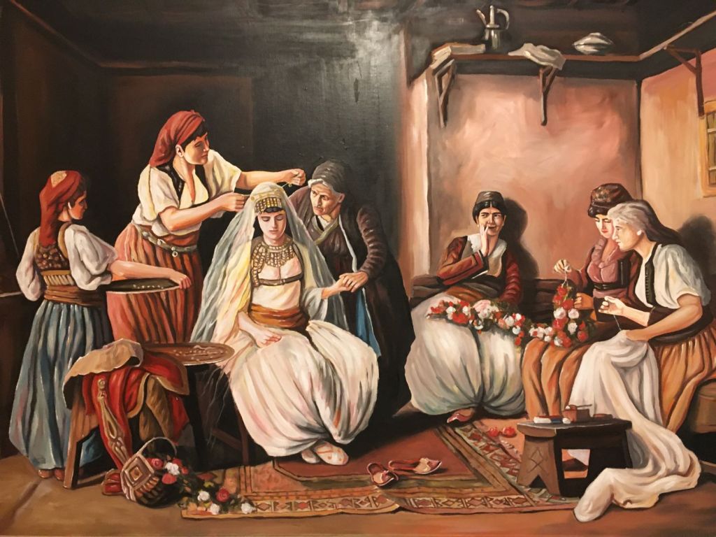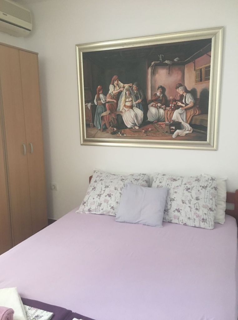 De cara já gostei. O prédio fica num beco estreitinho (como quase todos na cidade velha). Bonitinho, agradável… Mas o que me ganhou mesmo foi dar de cara com o meu quadro favorito do Museu Nacional de Belgrado pendurado na parede do quarto: “A Arrumação da Noiva”, de Paja Jovanović (1885-1888). O quadro retrata um casamento da região de Montenegro. Quando o vi, ainda em 2019, me apaixonei por ele. Tirei mil fotos do mesmo quadro… afinal agora tinha uma réplica no quarto… só pra mim! (Pelo menos até ir embora…).