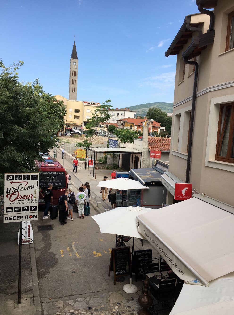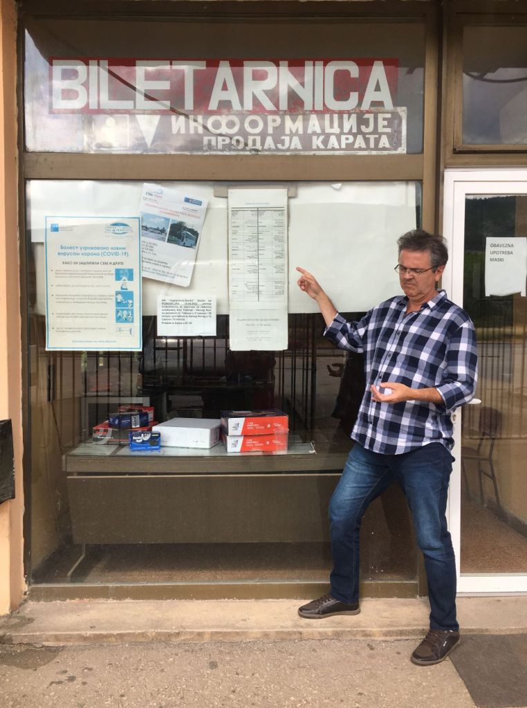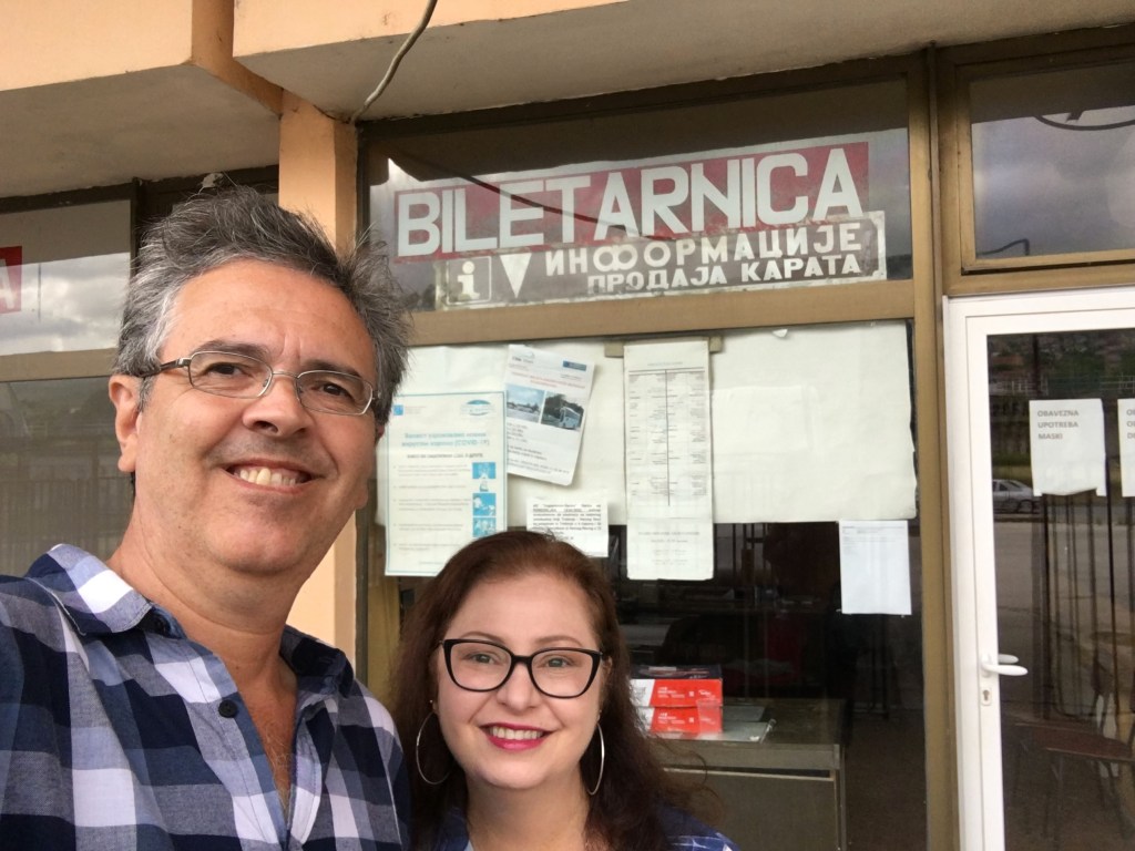 A viagem até lá foi uma aventura à parte. De Kotor (Montenegro) fomos de taxi até Bileća, um trajeto de 1h30. Passamos a imigração e logo chegamos na “rodoviária” (um estacionamento no meio do nada). Como o senhorzinho da bilheteria não falava inglês (querer o quê num vilarejo da fronteira da Bósnia?), a Vazi (nossa motorista) entrou e comprou as passagens pra nós. A gente só a via tentando explicar pro tiozinho (que ria) o que raios dois brasileiros estavam fazendo em Bileća no meio da semana, as 8:30 da manhã! Felizmente o ônibus que tínhamos visto no site getbybus existia mesmo! Era as 10:45 – com horário marcado na tabela na porta e tudo!