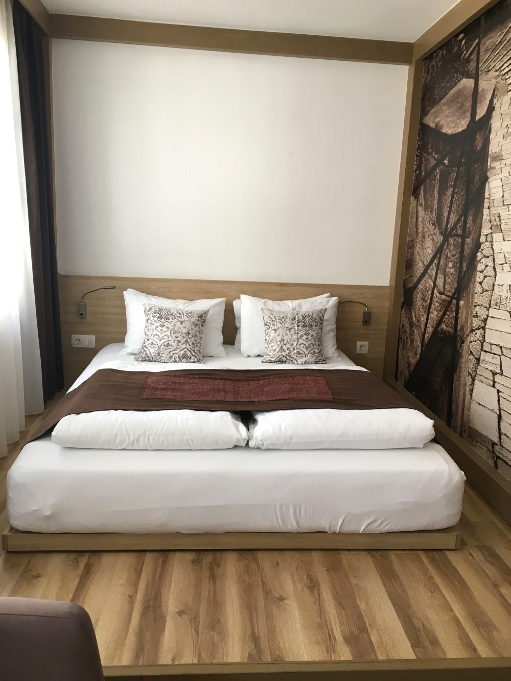 O Hotel Emen fica na rua Onešćukova, bem no miolo da cidade velha. O prédio principal estava cheio, então ficamos no novo, do outro lado da rua, que ainda não estava 100% reformado. O quarto era amplo e bem agradável, mas ficava ao lado das escadas, então tinha um pouco de barulho, o que não foi um grande problema porque tinha poucos hóspedes. Havia também um pequeno jardim de inverno de onde tínhamos uma belíssima vista das montanhas. Pagamos R$608,71 por duas noites.