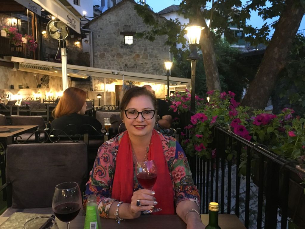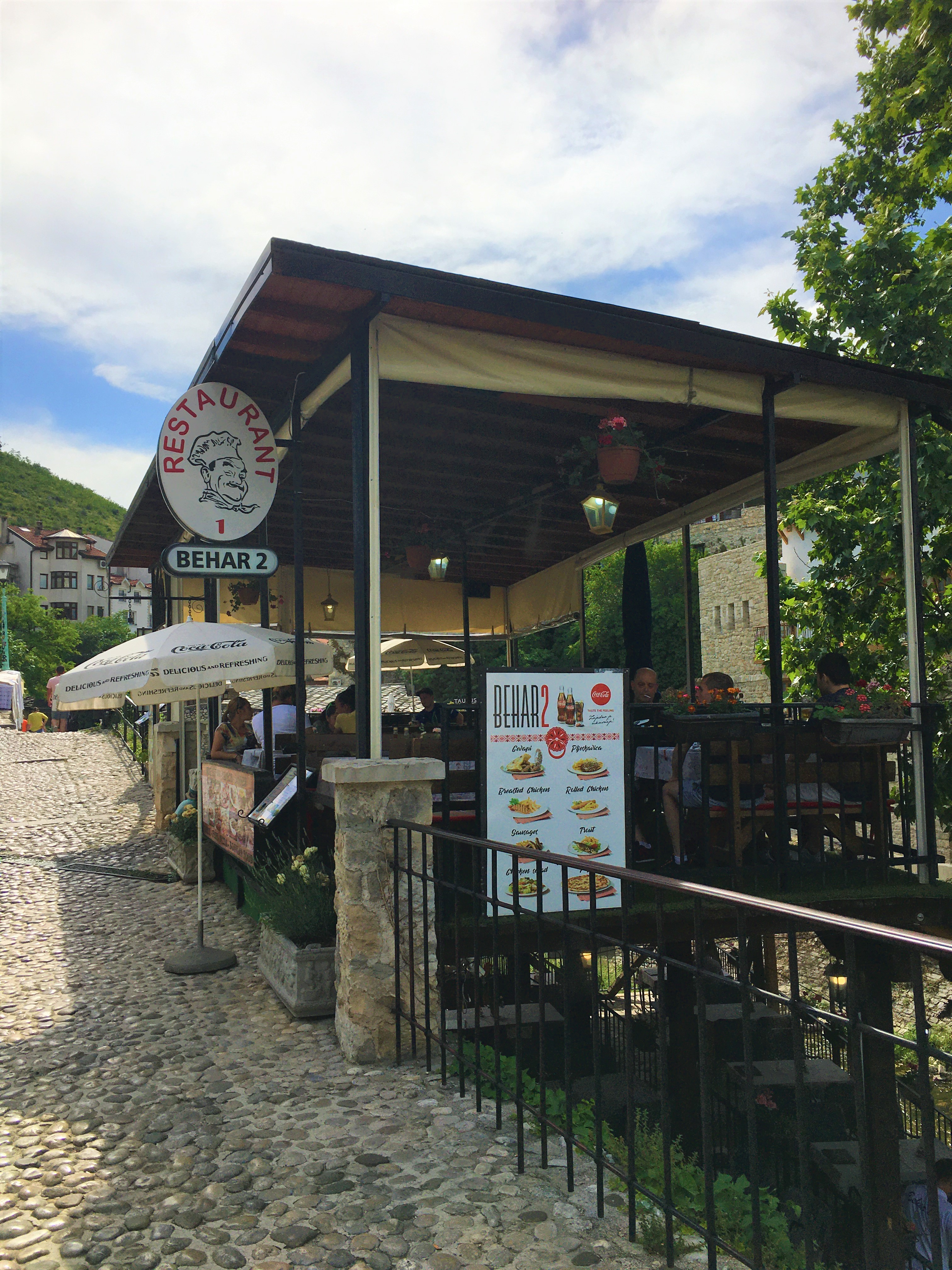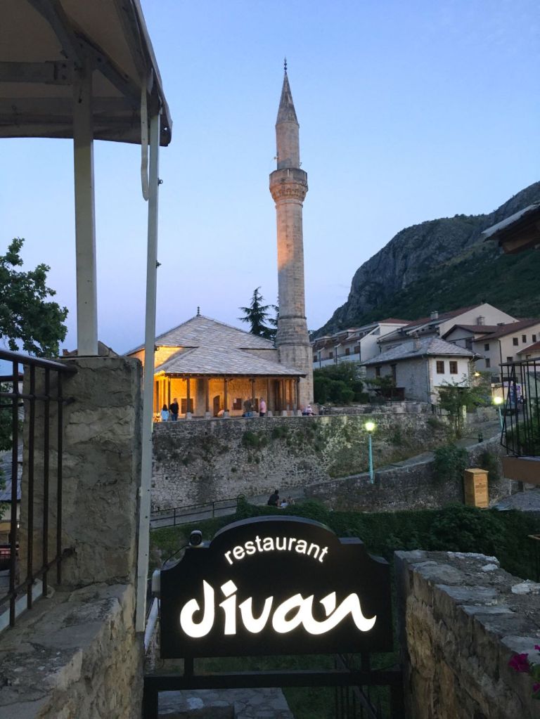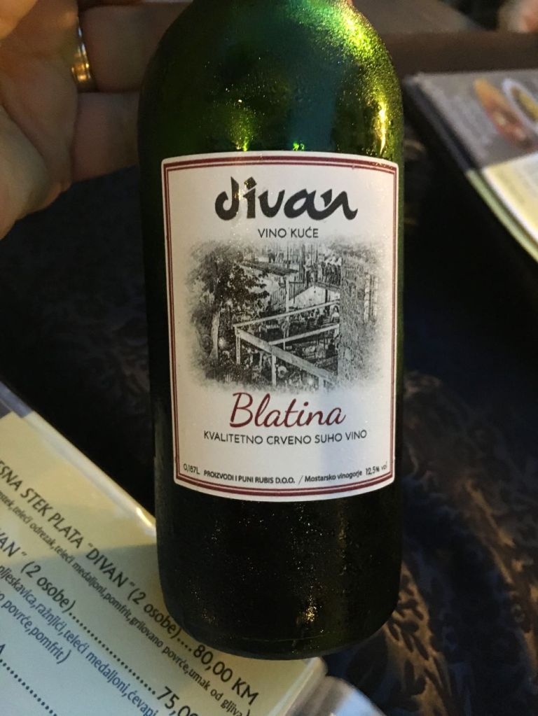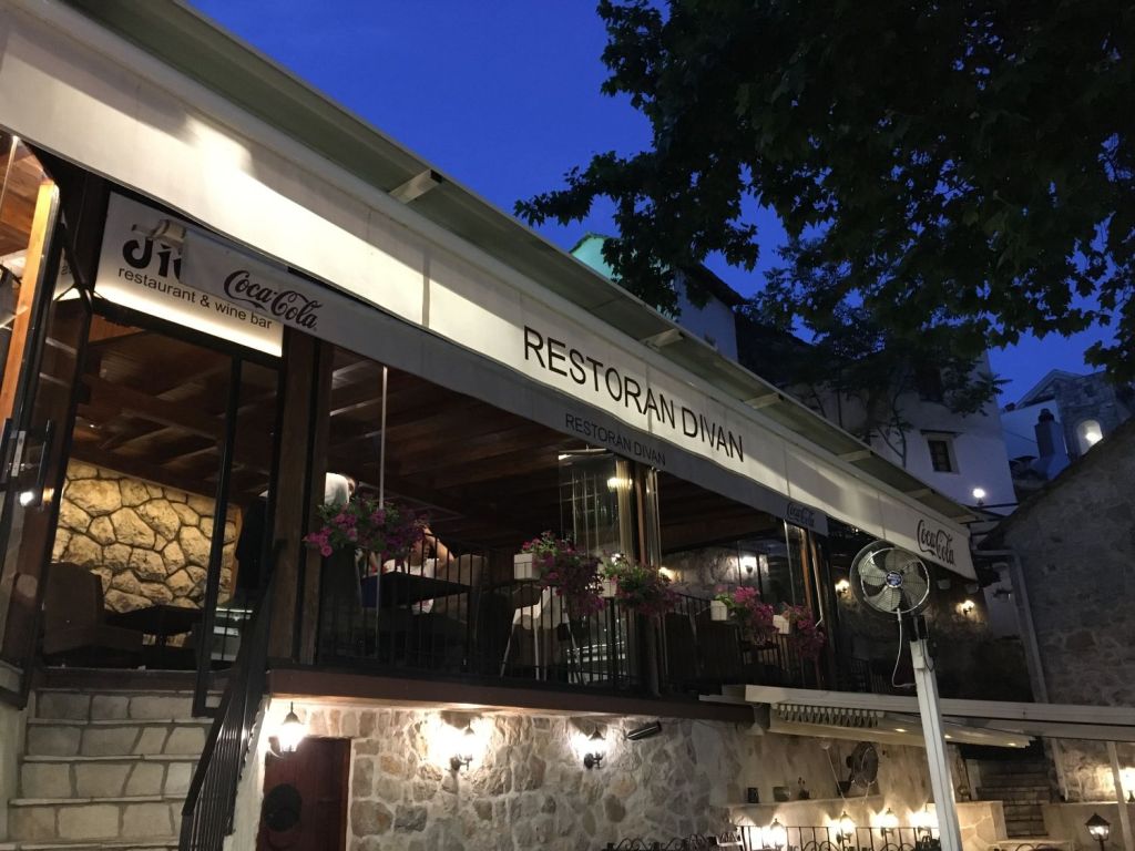 O Divan tem localização privilegiada, bem ao lado do rio Radobolja. A vista é genial e vale muito a pena. Fomos para o jantar e, calor danado, pedimos uma grande e deliciosa salada caprese e o pileći fileti (um filé de frango ao molho de champignons). Pra acompanhar, uma garrafa do vinho da casa. Delicioso!
